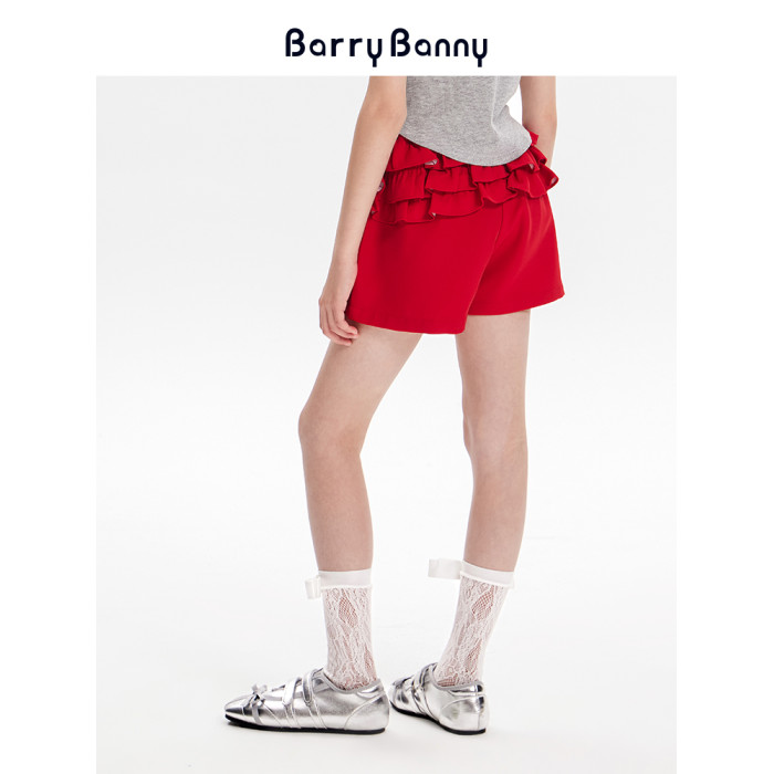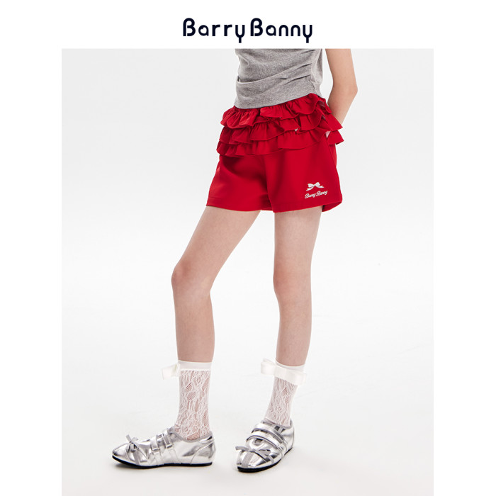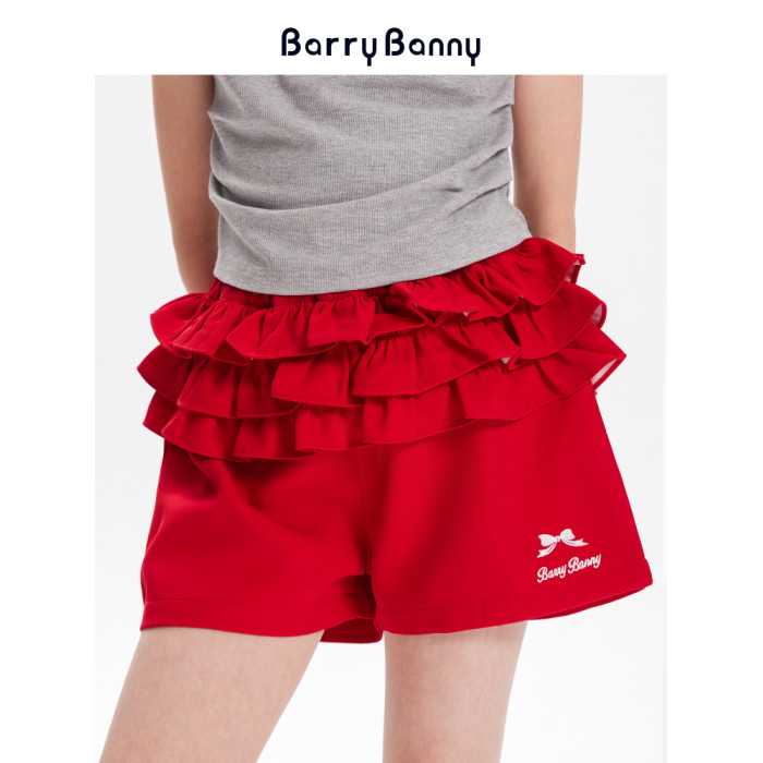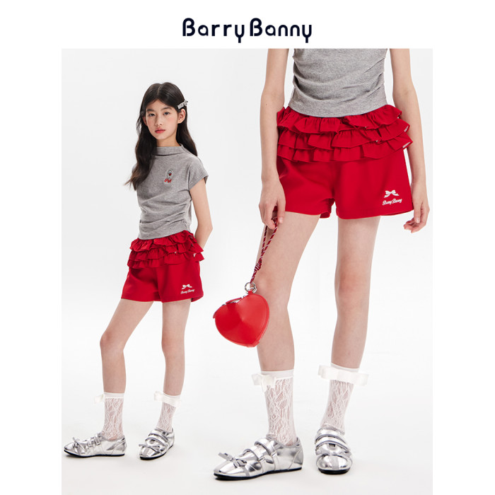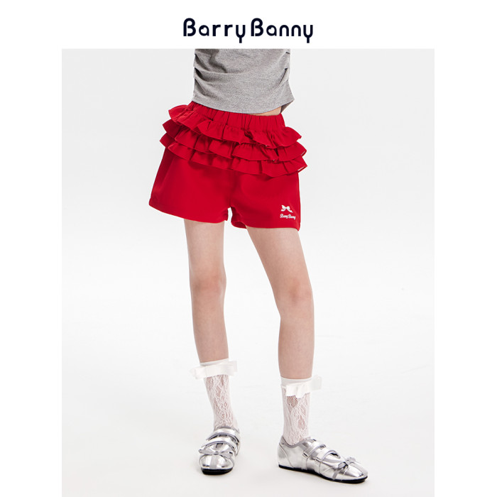 BarryBanny女童花苞短褲2025夏季新款中大童紅色中腰修身顯瘦褲子