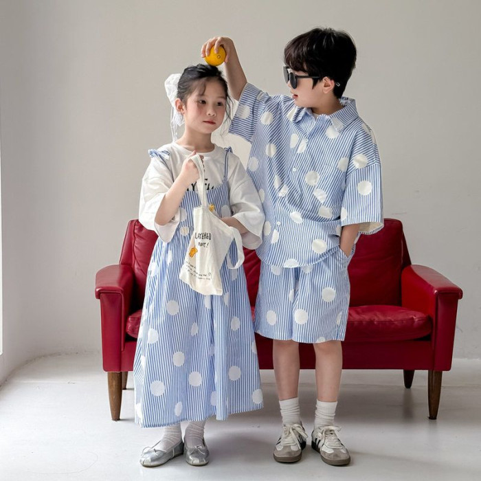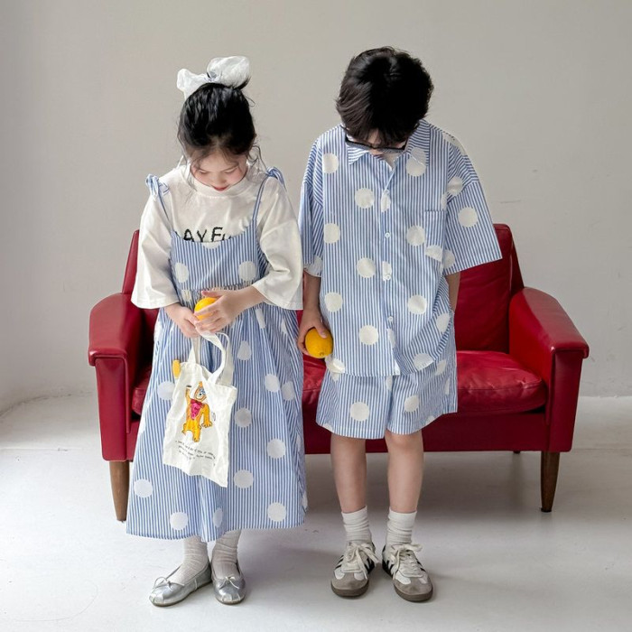 2025新款兒童兄妹裝夏季男女童親子裝龍鳳胎洋氣純棉短袖襯衫套裝