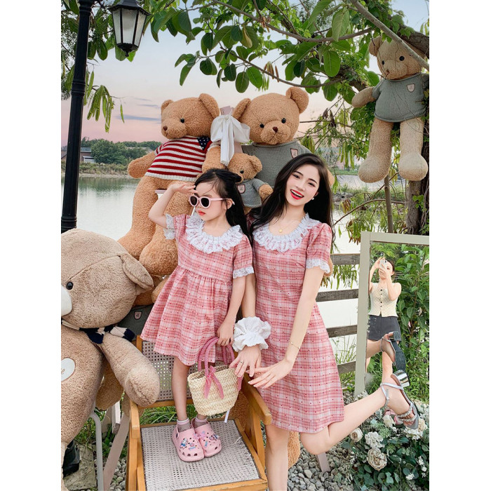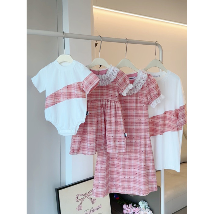 高級親子裝一家三口夏裝母子母女裝格子小月齡嬰兒短袖T恤連衣裙
