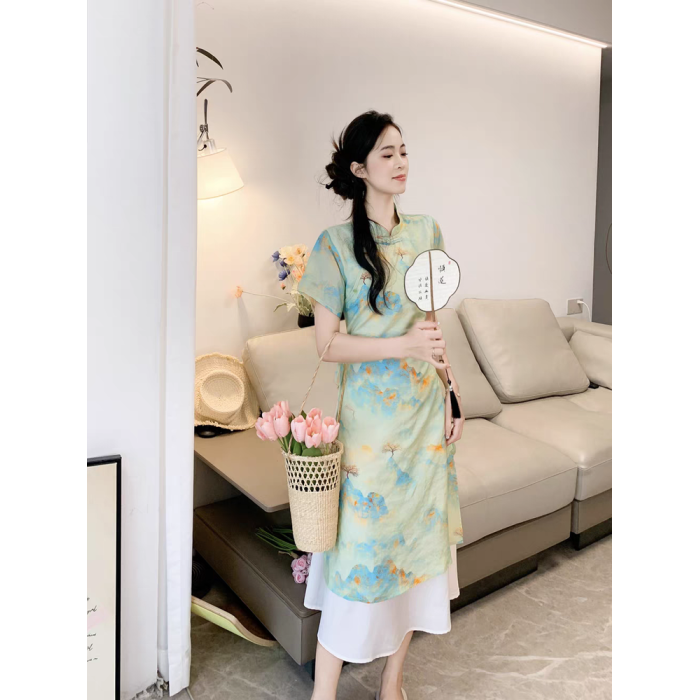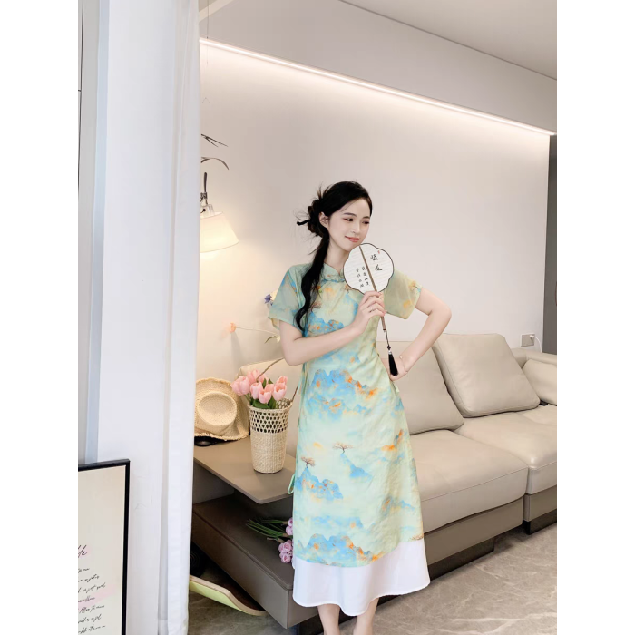 新中式國風款親子裝套裝母女子旗袍漢服連衣裙一家三口夏短袖t恤T