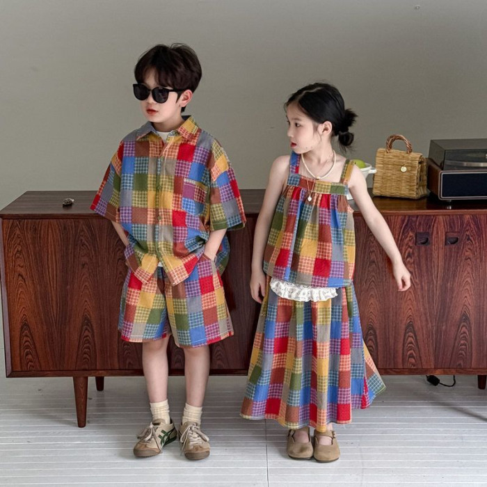 2025新款兄妹裝兒童夏季男女童韓版炸街格子襯衫龍鳳胎親子裝套裝