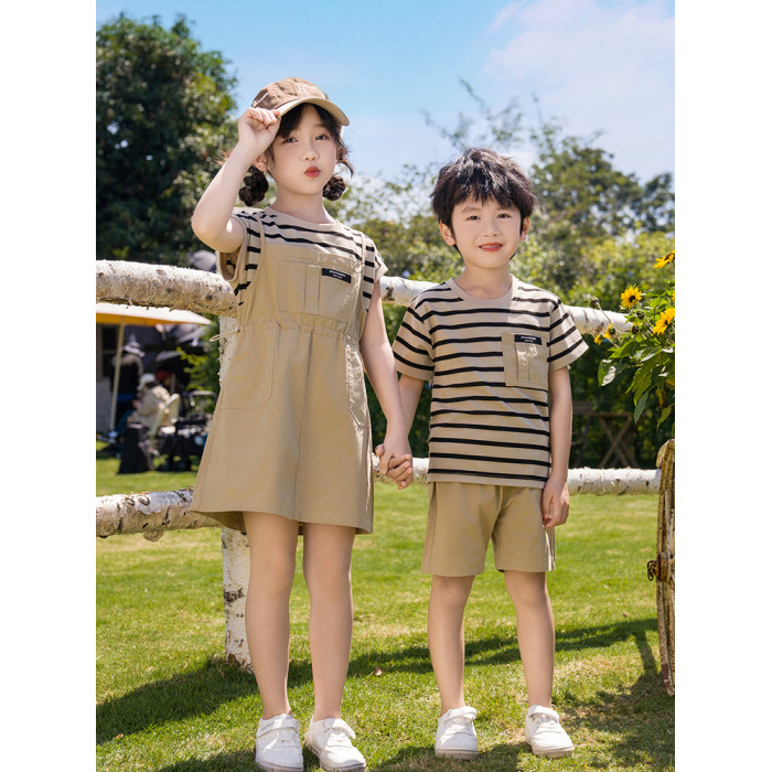 2025親子裝夏天一家三口四條紋 T恤假兩件背帶連衣裙洋氣母女炸街