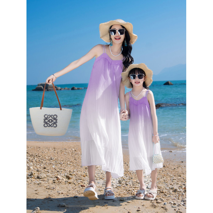 三亞度假親子裝夏裝一家三口夏季海邊沙灘裙漸變色母女吊帶連衣裙