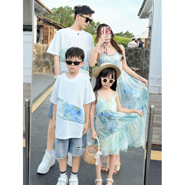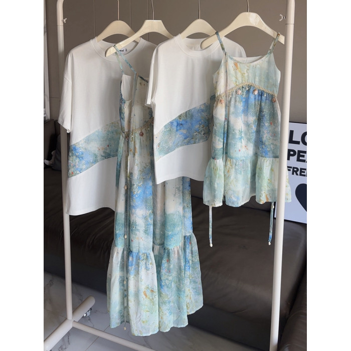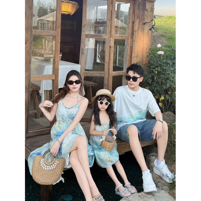 出遊度假親子服裝母女沙灘一家三口四口母子夏新疆雲南旅遊連衣裙