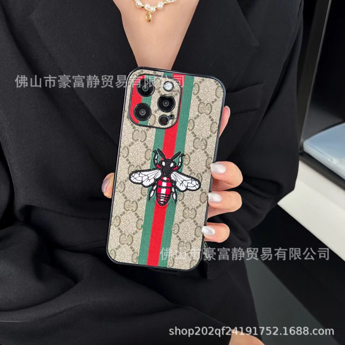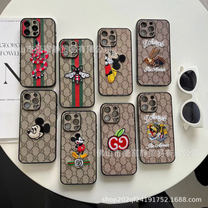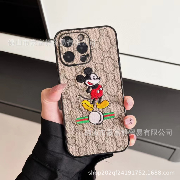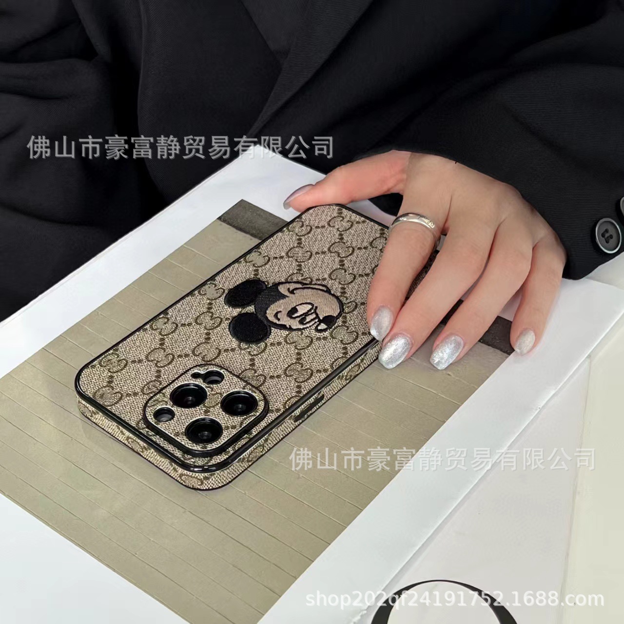 潮牌刺綉卡通公仔手機殼適用蘋果16Pro全包11皮質14Pro軟殼米奇13