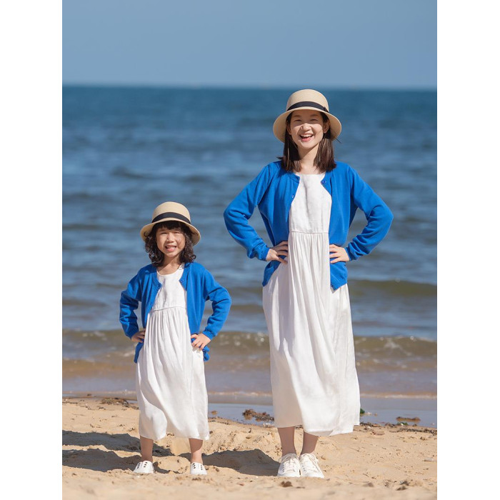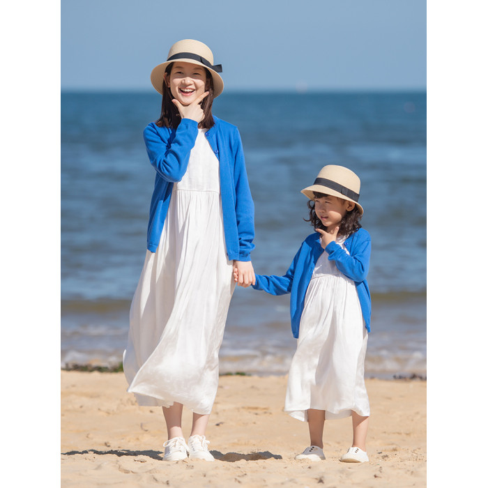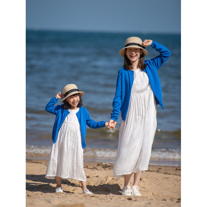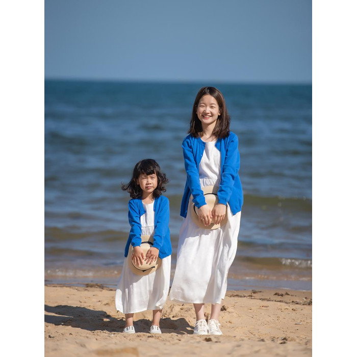 小樂往親子裝122課 春秋藍色棉開衫海邊草原度假拍照寫真母女外套
