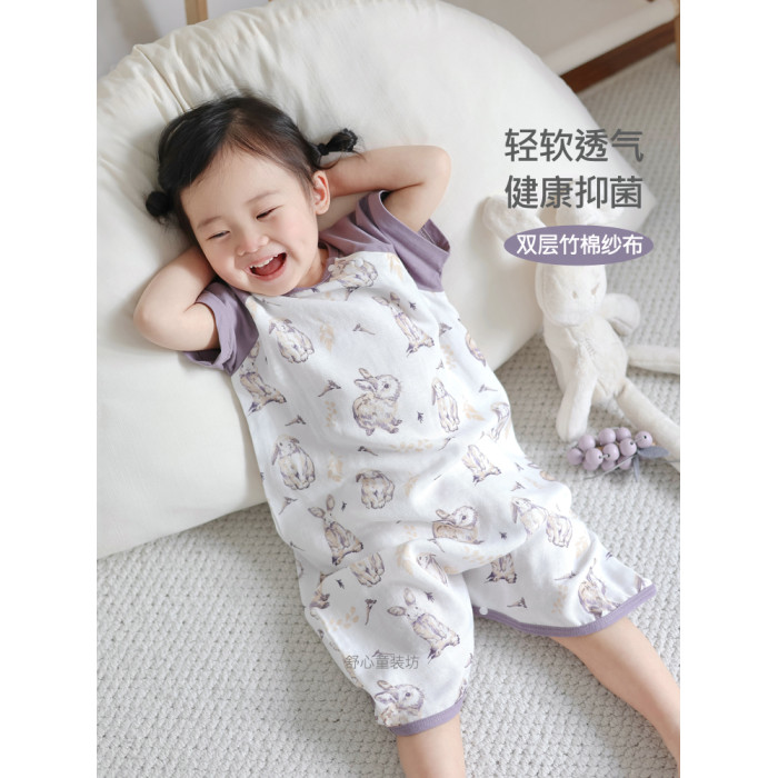 夏季雙層竹棉紗布連體睡衣寶寶家居服嬰兒睡袋兒童短袖睡裙親子裝