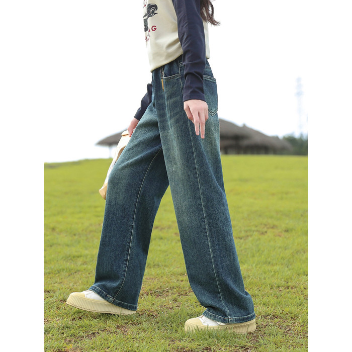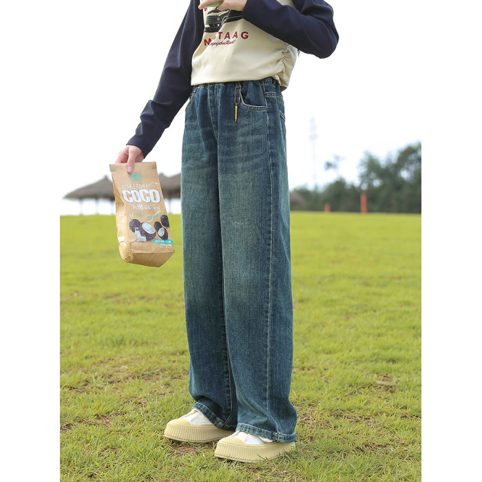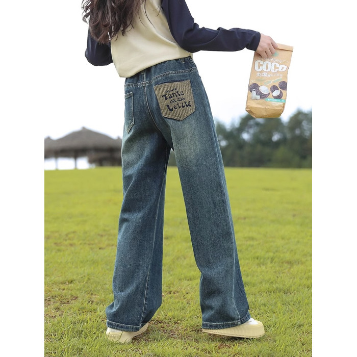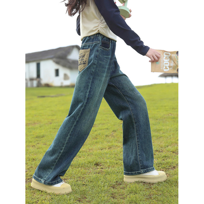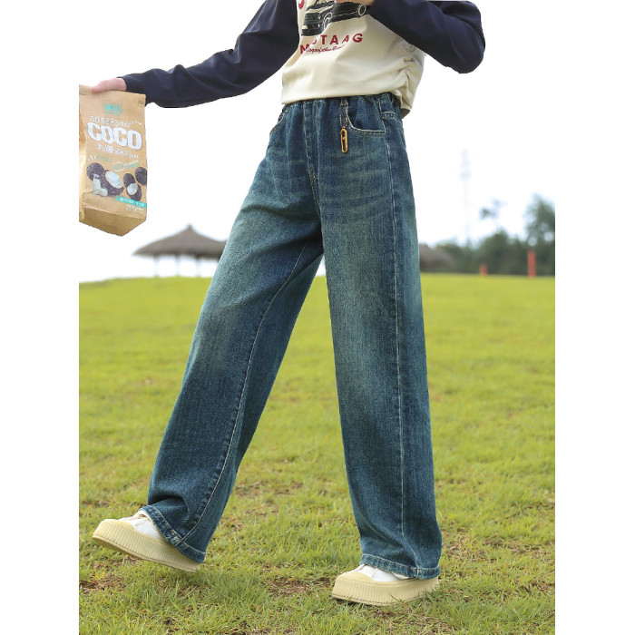 女童牛仔褲春裝2025新款大童初中生濶腿褲春季兒童直筒褲子春秋款