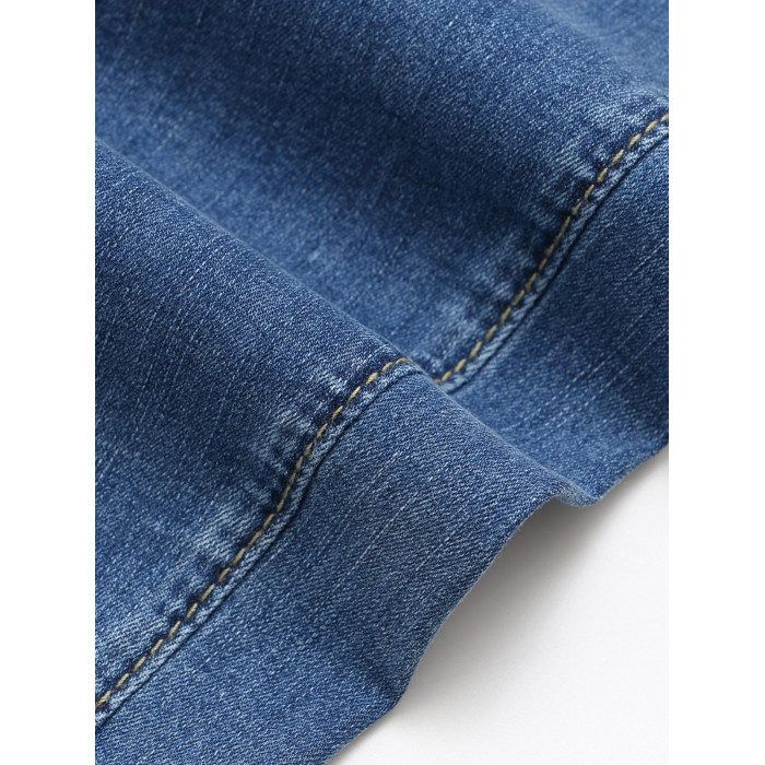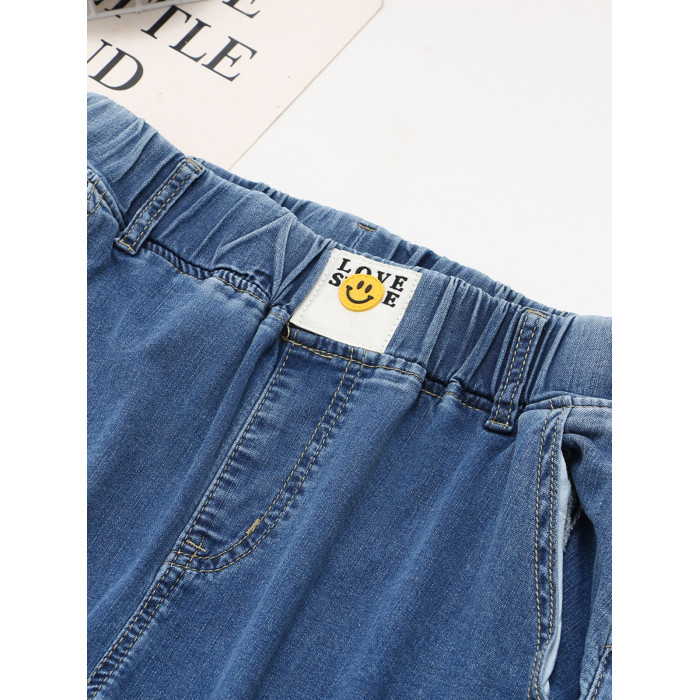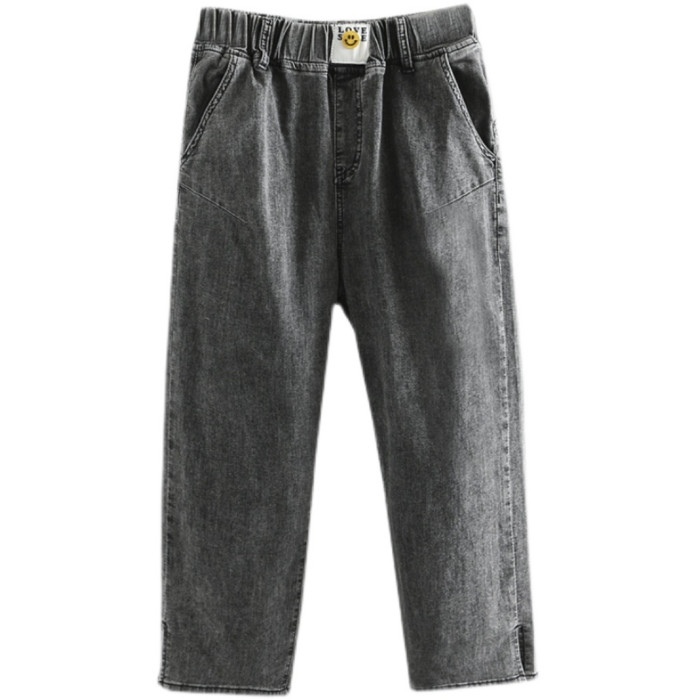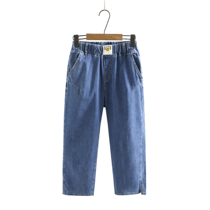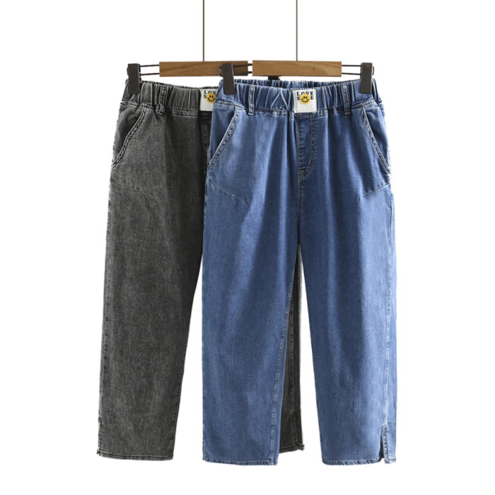 2023夏季韓版新款大碼女牛仔褲松緊腰笑臉字母彈力開叉八分褲