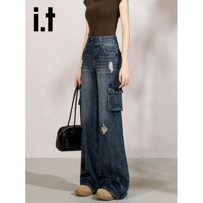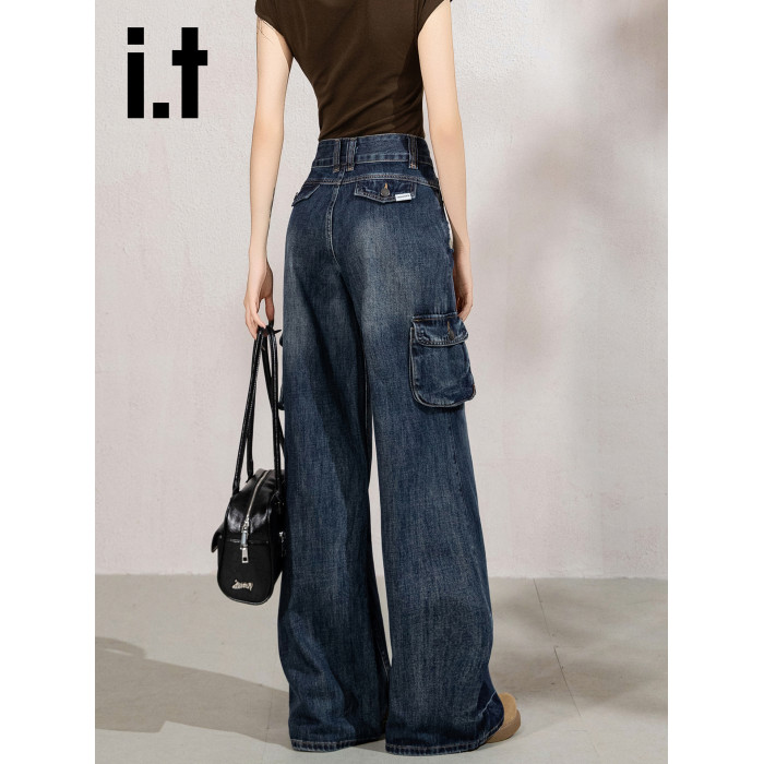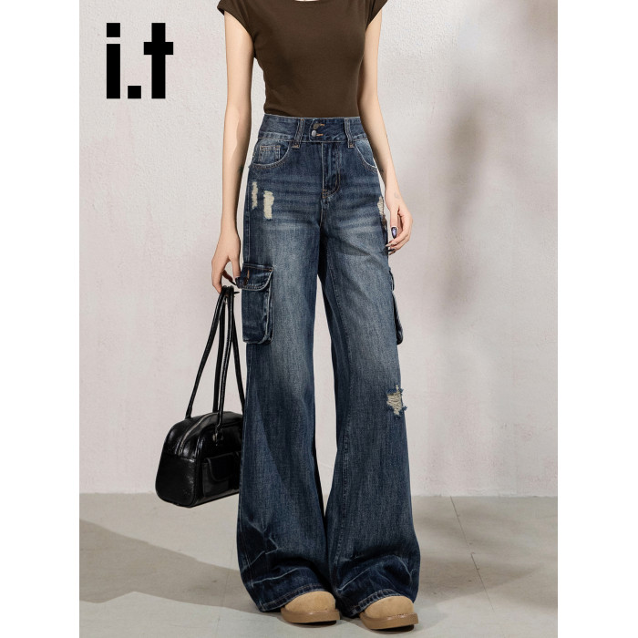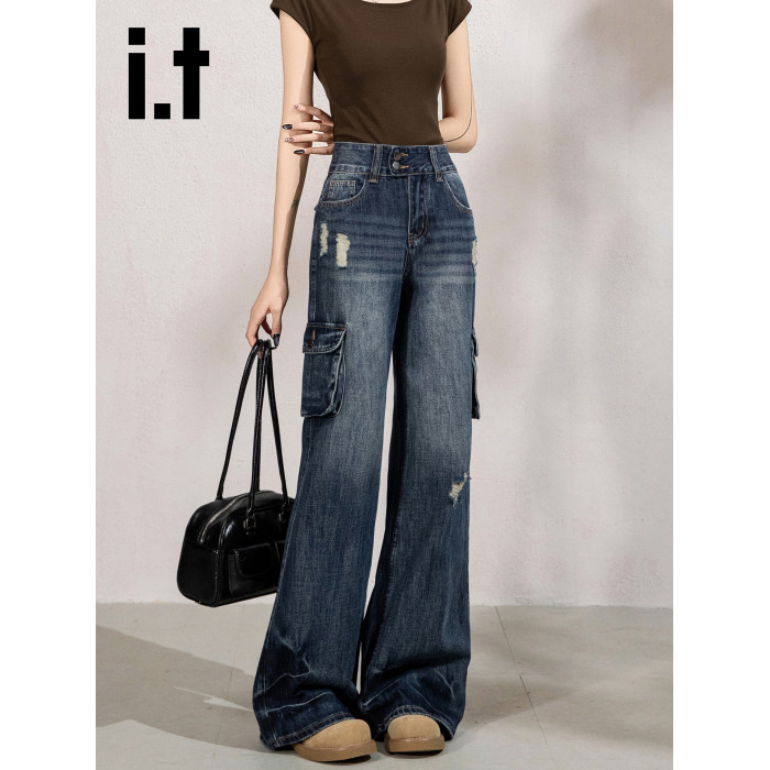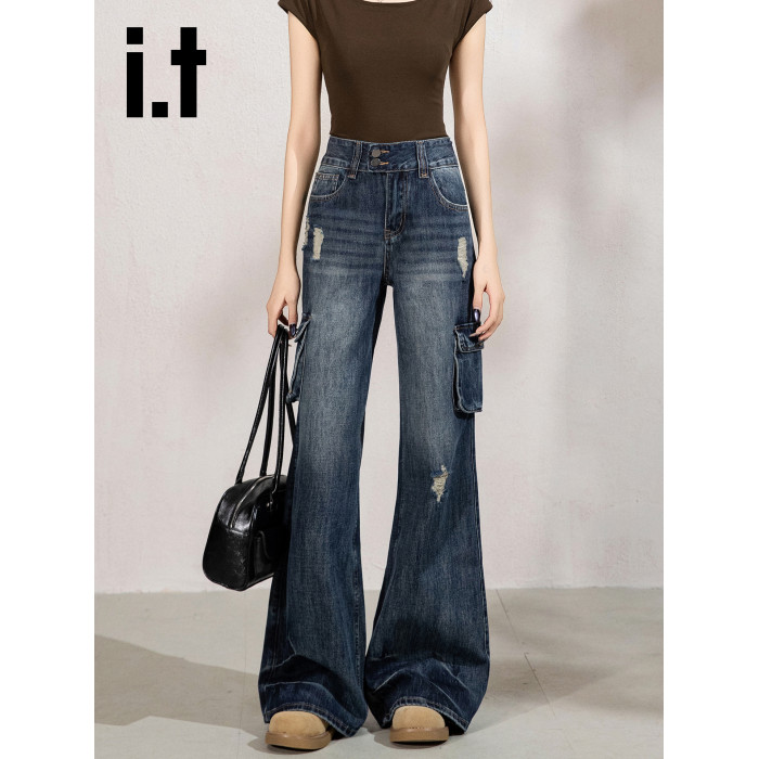 it:CHOCOOLATE微喇工裝褲女牛仔褲女高腰顯瘦美式辣妹喇叭長褲子