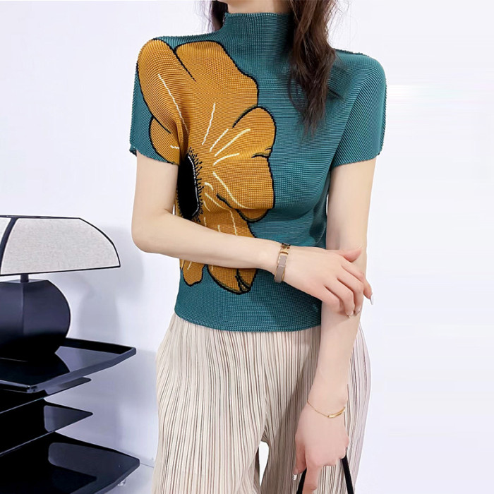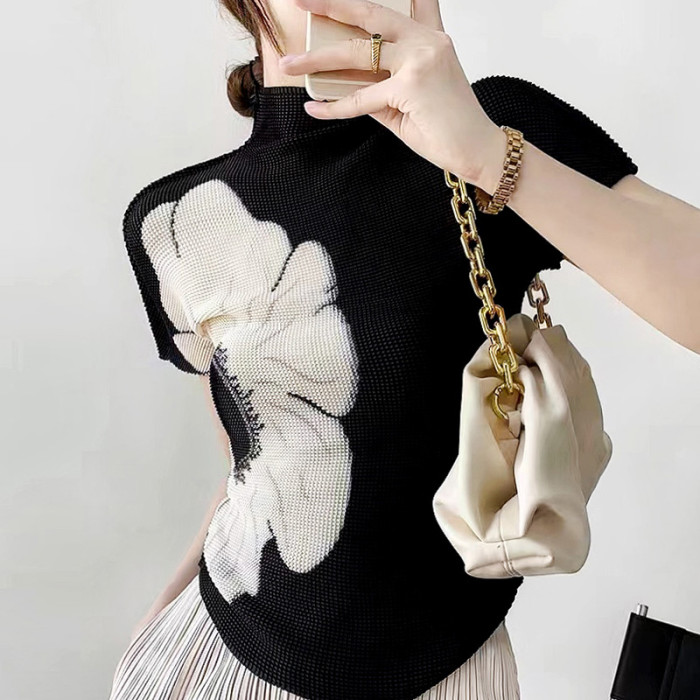 大花朵撞色刺綉針織衫女氣質通勤半高領褶皺短袖緊身顯瘦打底衫夏