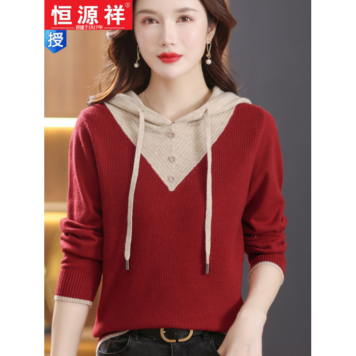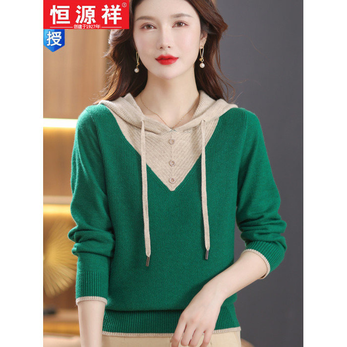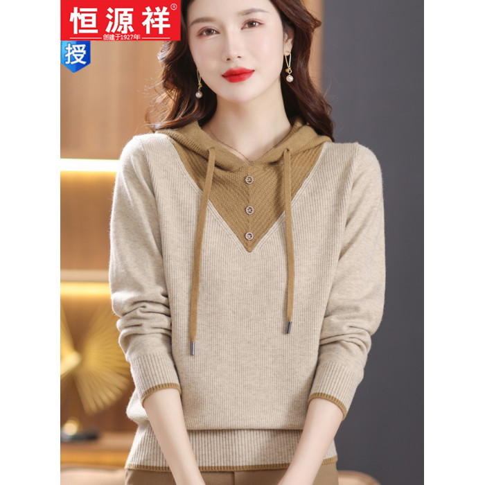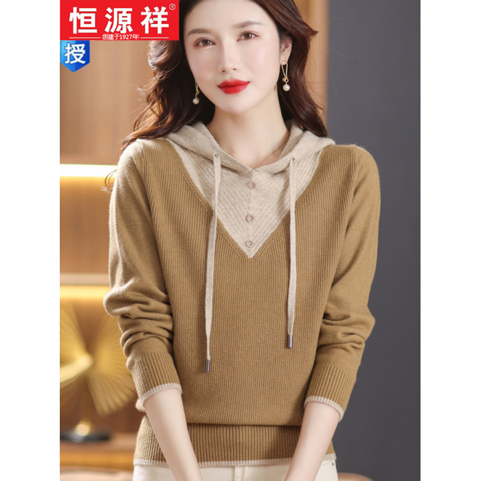 恒源祥羊毛衫女連帽針織衫衛衣春秋新款寬松打底衫假兩件外穿毛衣