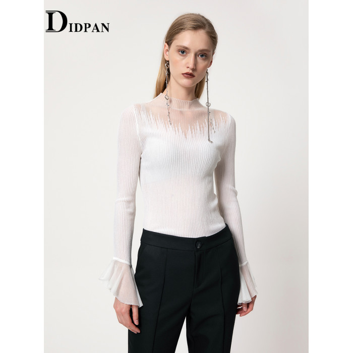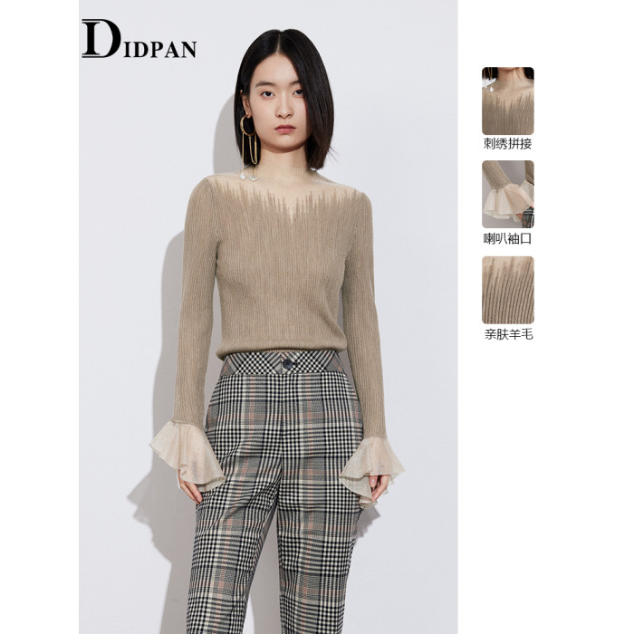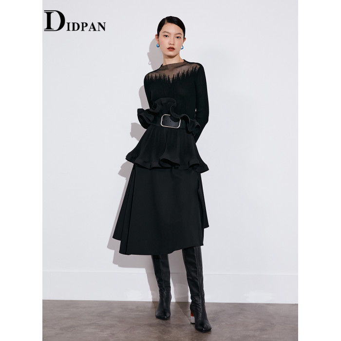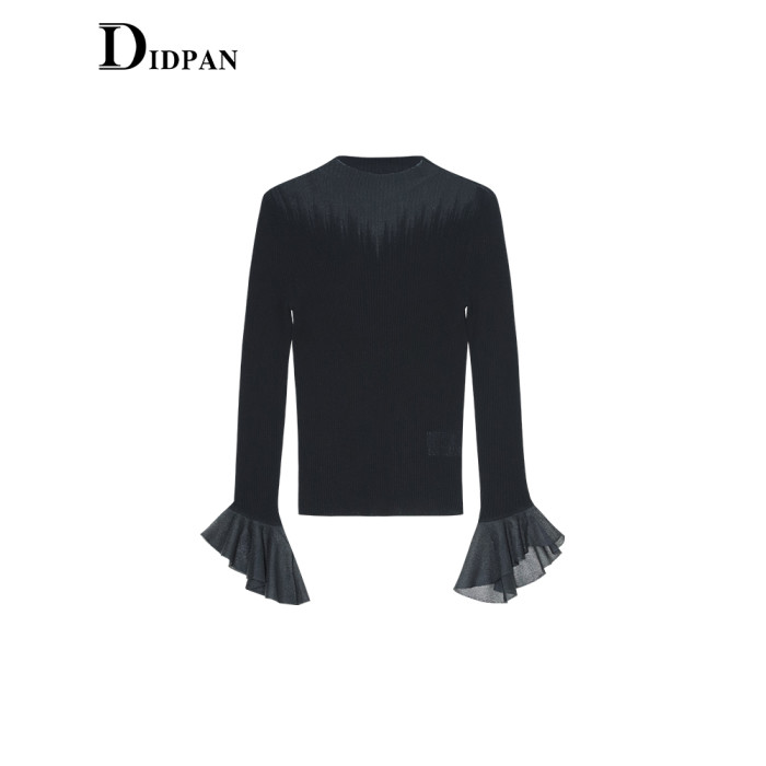 IDPAN流行漂亮毛衣女喇叭袖高級感打底衫獨特黑色肌理感針織衫