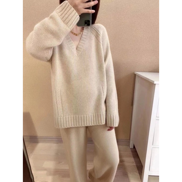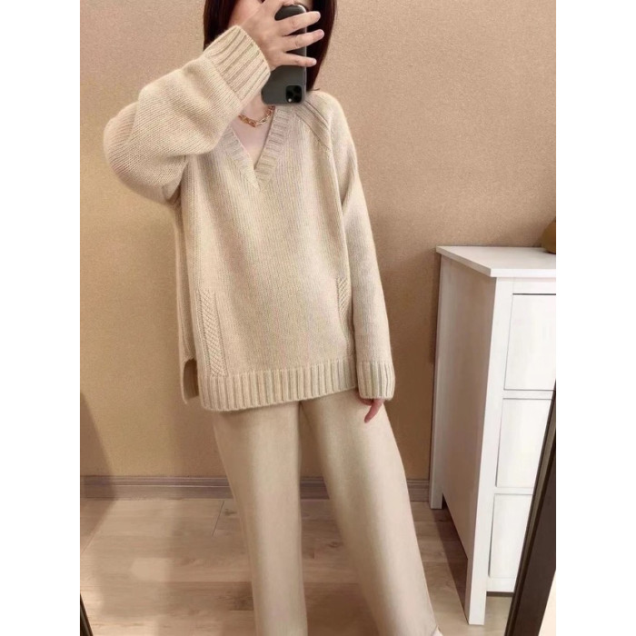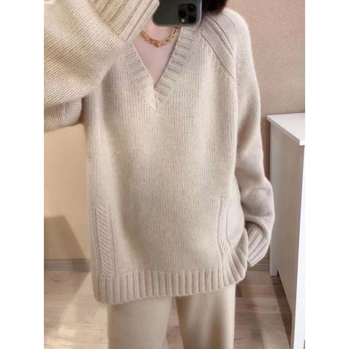 秋冬羊絨衫女V領毛衣寬松套頭純色長袖上衣慵懶羊毛針織打底衫