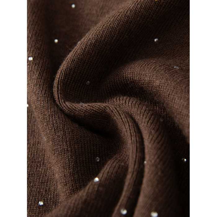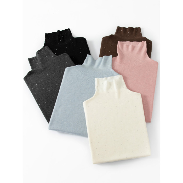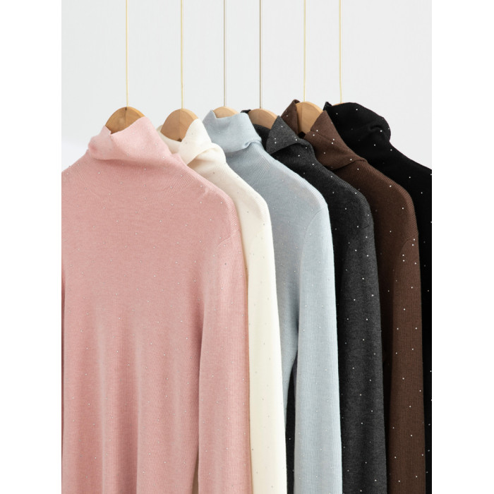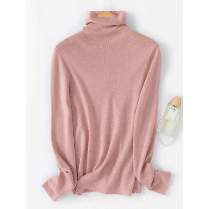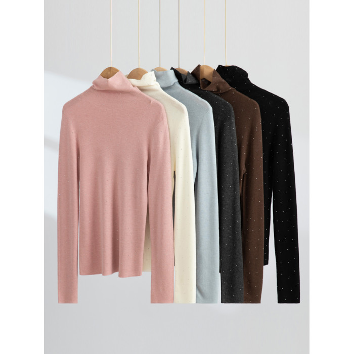 秋冬新款純色堆堆領套頭羊絨毛衣女百搭鑲鑽長袖羊毛針織打底衫潮