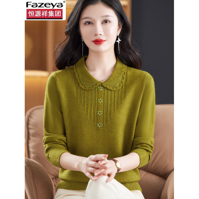 恒源祥彩羊羊毛衫女2025新款春秋媽媽翻領紅色毛衣針織上衣打底衫