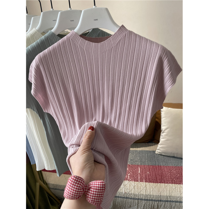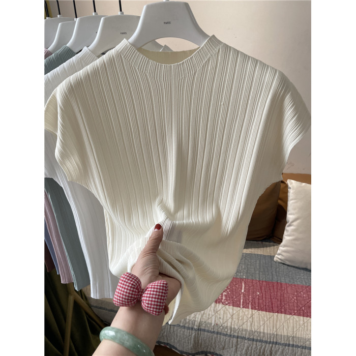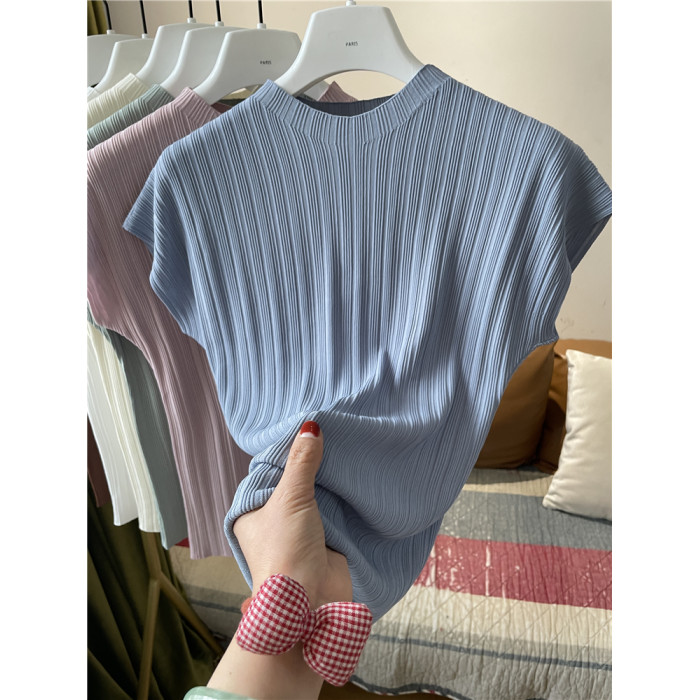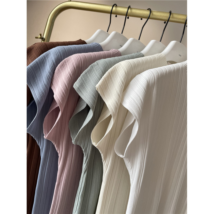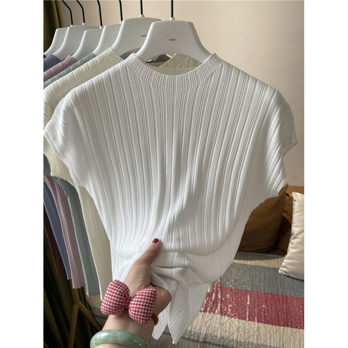 冰絲坑條暗紋理竪條紋春夏季圓領短袖針織衫女修身顯瘦打底衫上衣