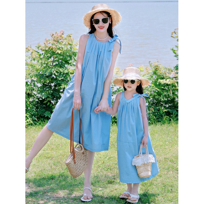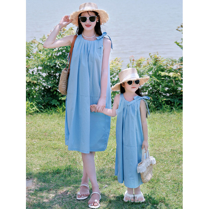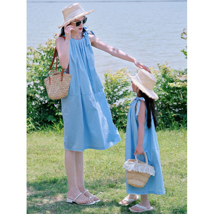 海邊度假親子裝母女裝2025新款夏海南三亞沙灘海島出遊藍色連衣裙