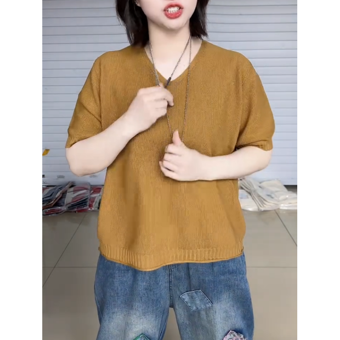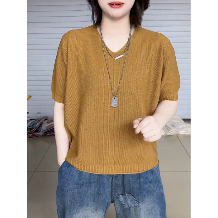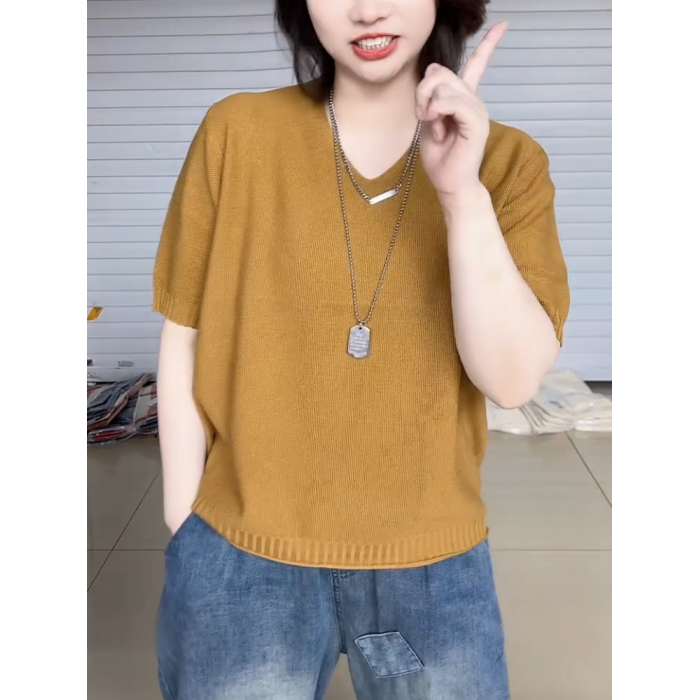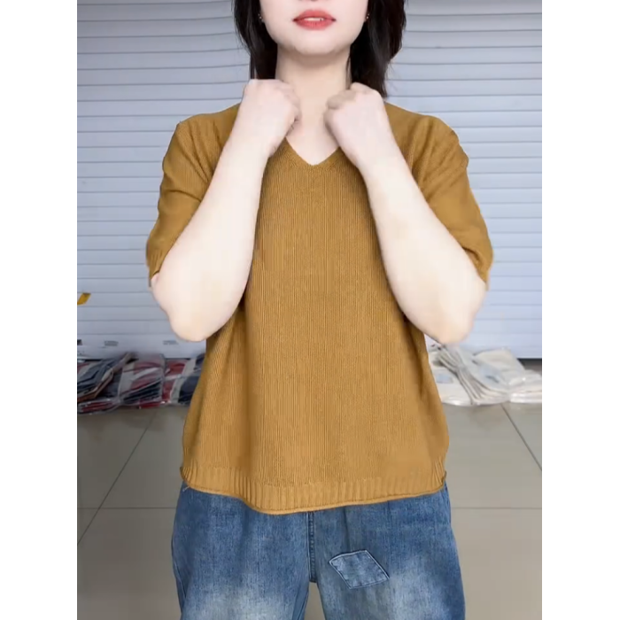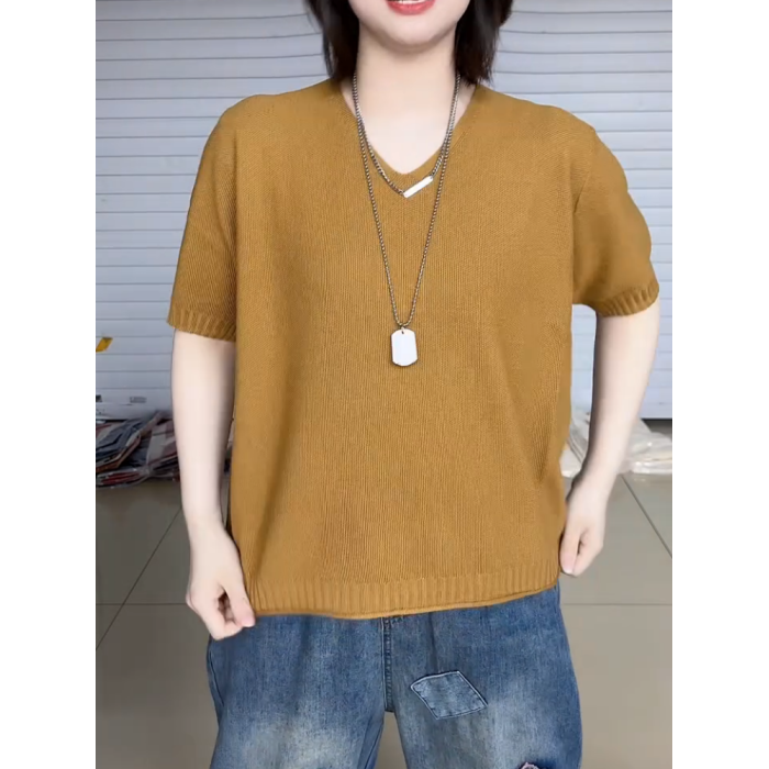 純色短袖V領針織衫女2025韓版大碼寬松套頭打底衫時髦減齡毛衣潮