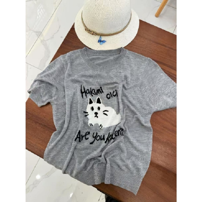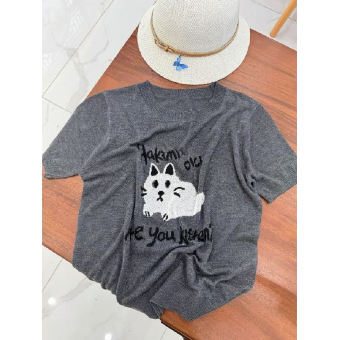 卡通貓咪提花薄款針織短袖女夏季新款韓版寬松休閒圓領打底衫上衣