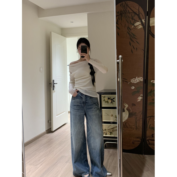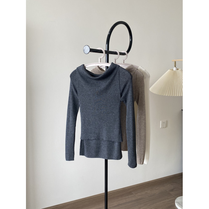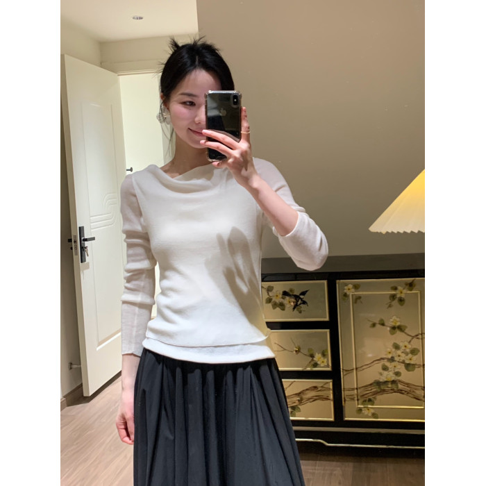 SW露鎖骨斜肩設計感不規則松弛感褶皺修身顯瘦蕩領打底衫上衣薄款