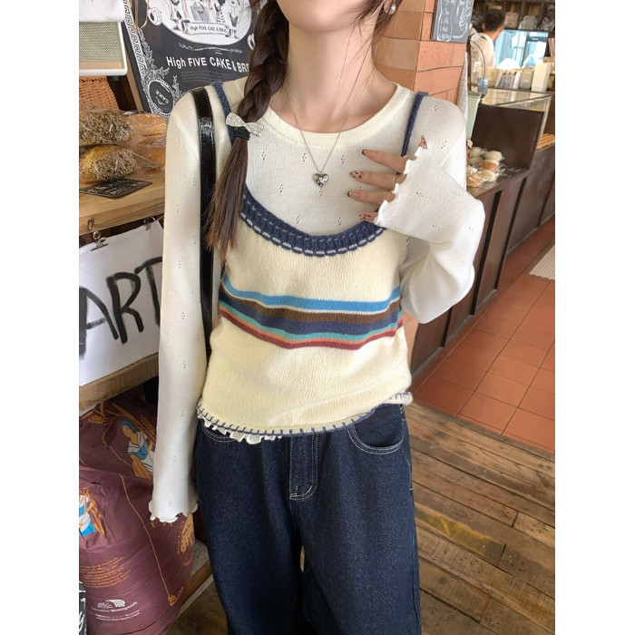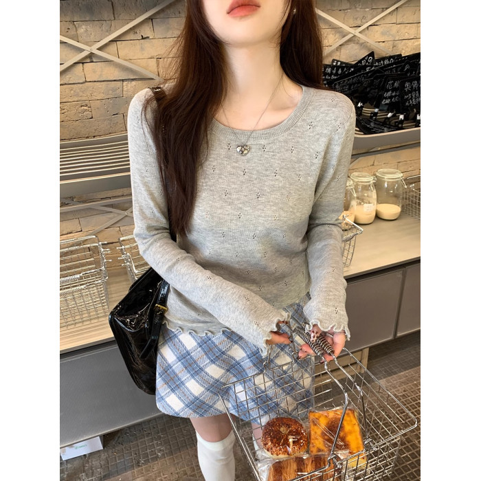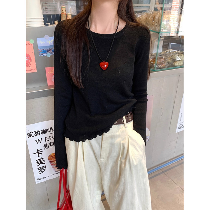 圓領超好看打底衫女春秋冬季內搭可外穿木耳邊針織衫鏤空白色毛衣