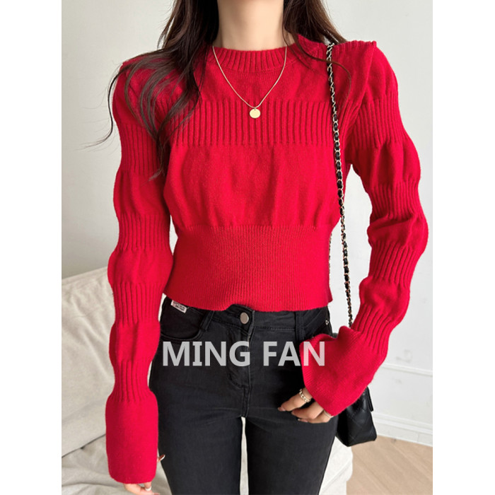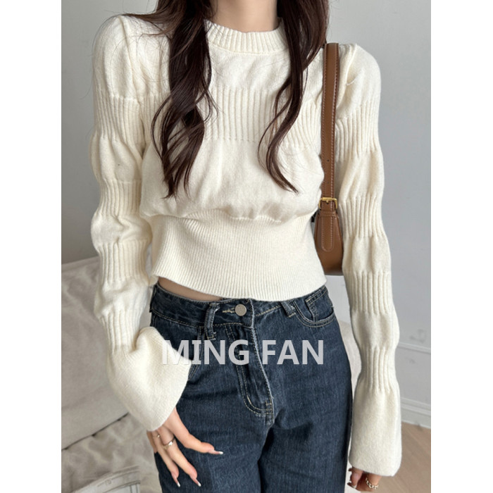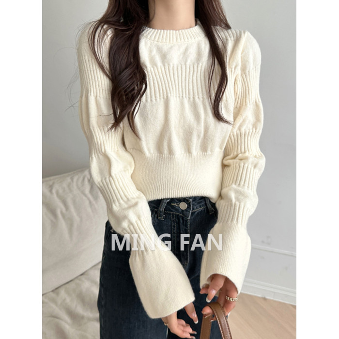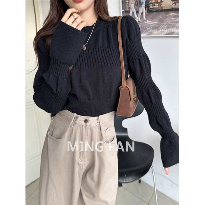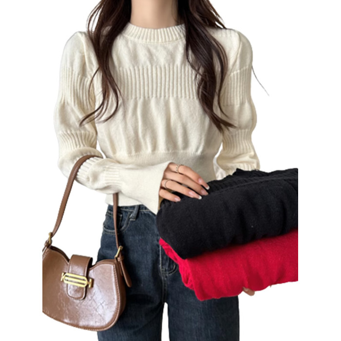 2025年新款女裝秋冬季圓領泡泡袖針織打底衫麻花保暖毛衣內搭上衣