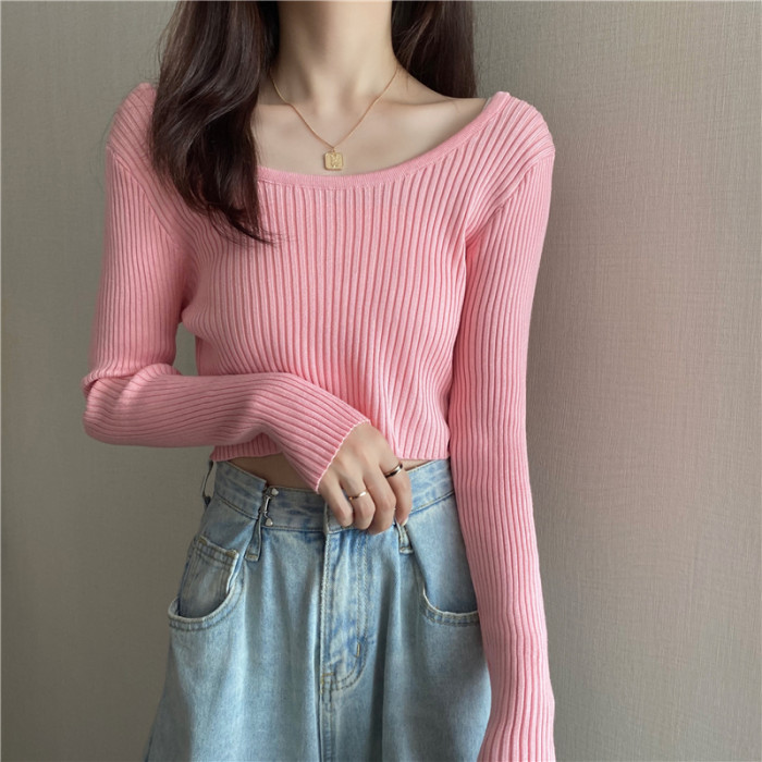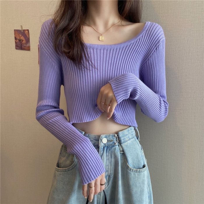 潮牌春秋辣妹白色短款上衣女長袖修身內搭薄款高腰露臍針織打底衫