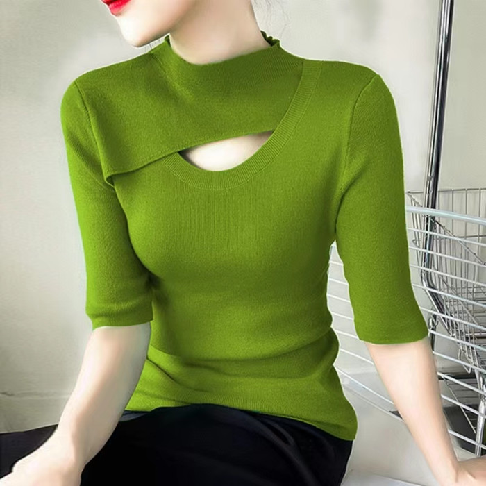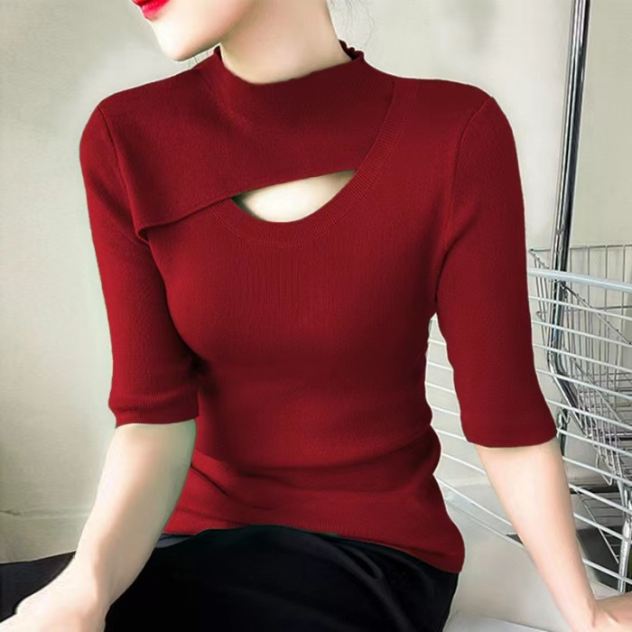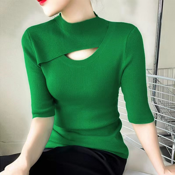 2025春秋新款歐貨設計感鏤空半高領五分袖中袖針織衫打底衫上衣女
