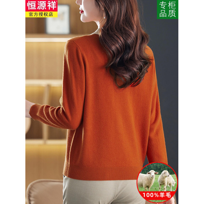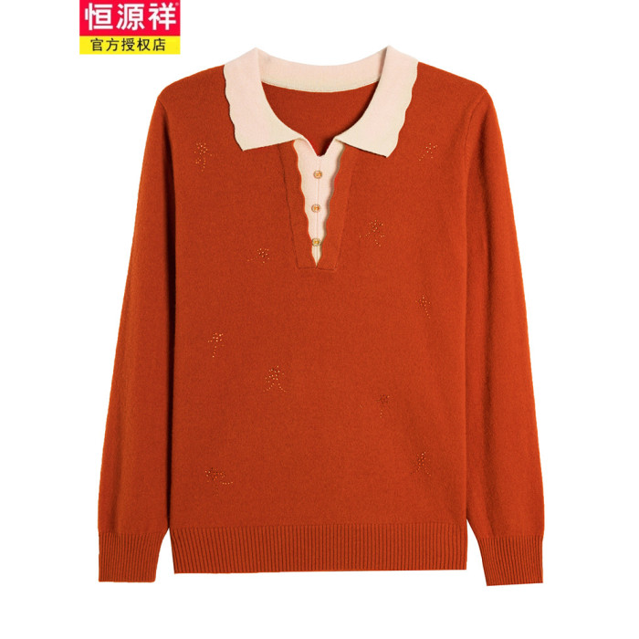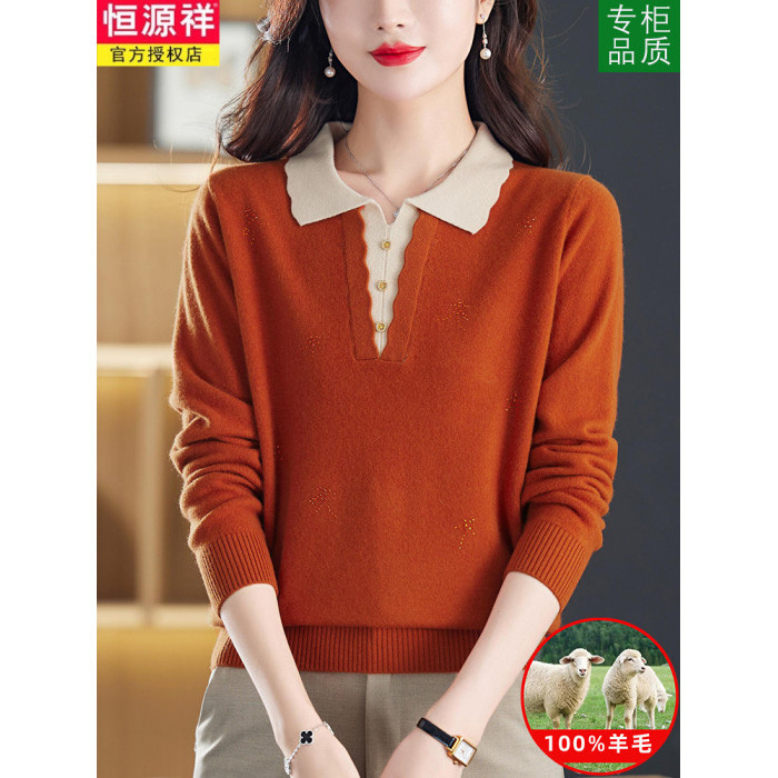 恒源祥翻領羊毛衫女秋季新款寬松大碼帶領毛衣外穿大碼針織打底衫