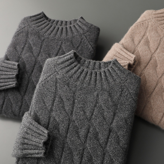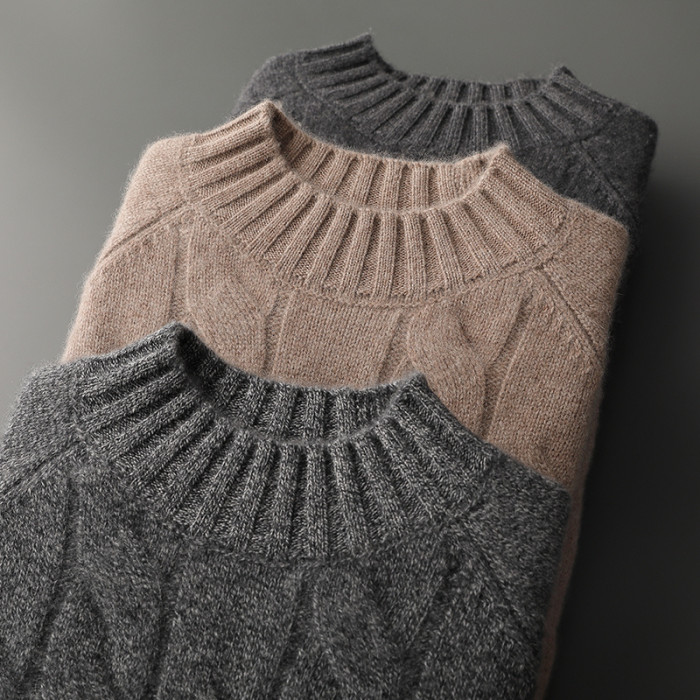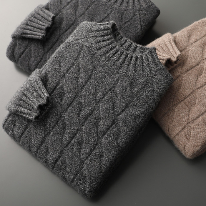 三股加厚保暖100%純山羊絨衫男半高領扭花毛衣輕奢男裝針織打底衫