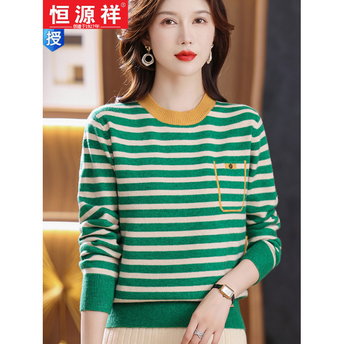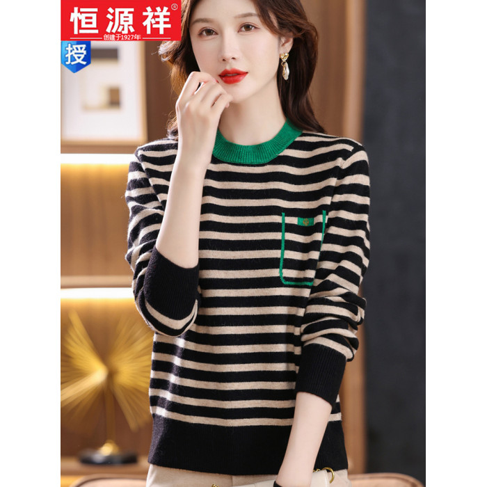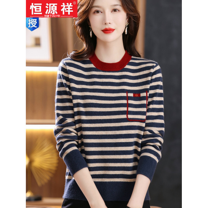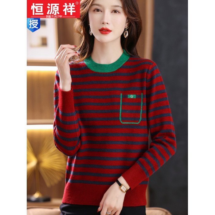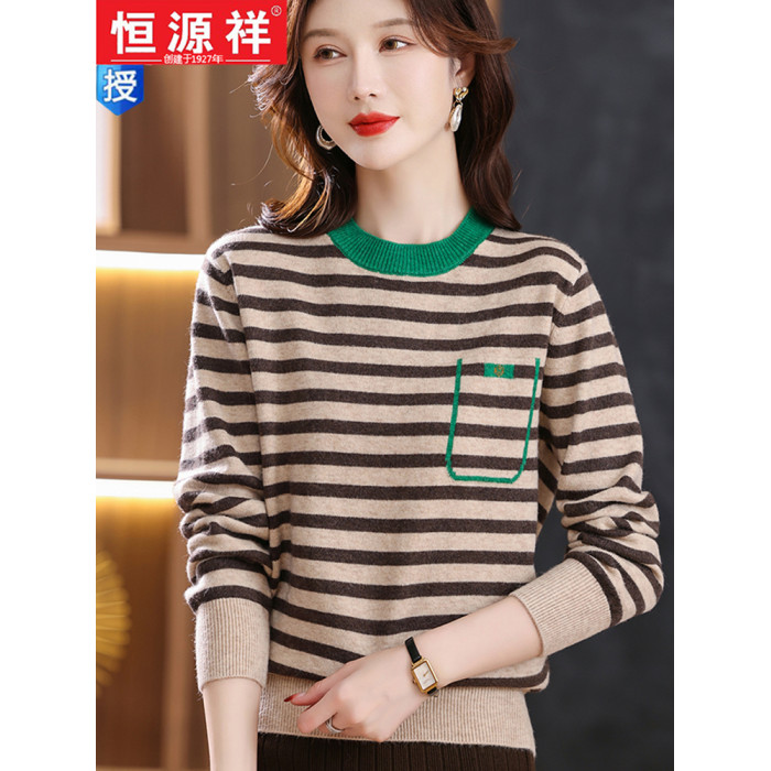 恒源祥羊毛衫女圓領大碼毛衣條紋上衣針織打底衫拼色內搭秋冬短款