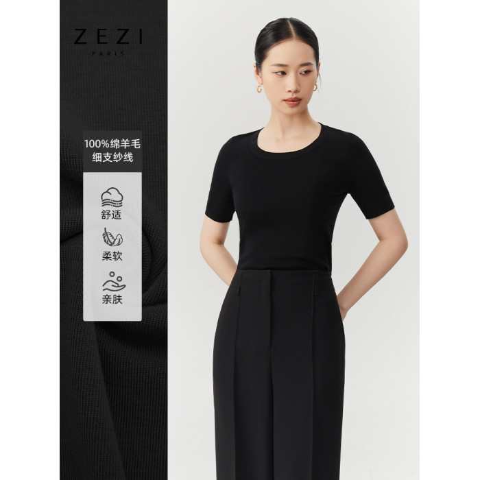 zezi羊毛u領針織衫短袖女羊毛衫100純羊毛春秋緊身打底衫低領短袖