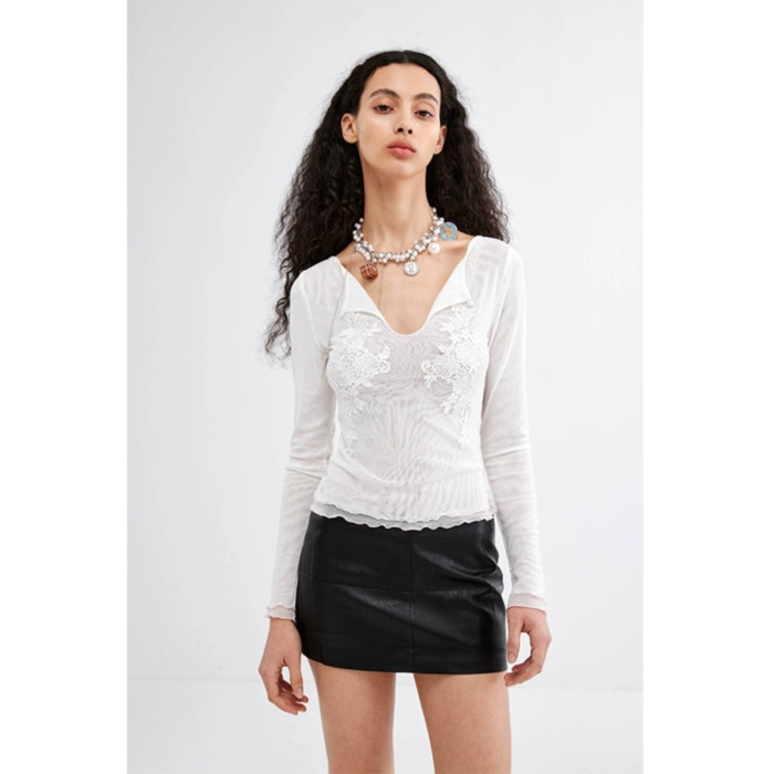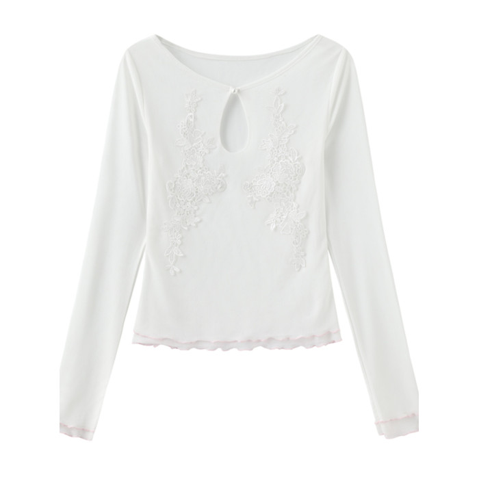 【九伍公園】原創設計白色網紗刺綉收身顯瘦長袖襯衫打底衫