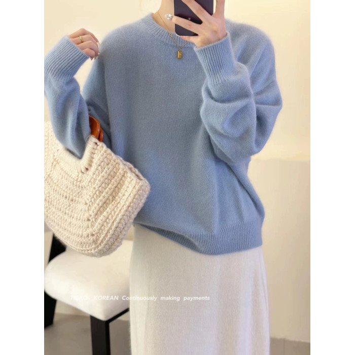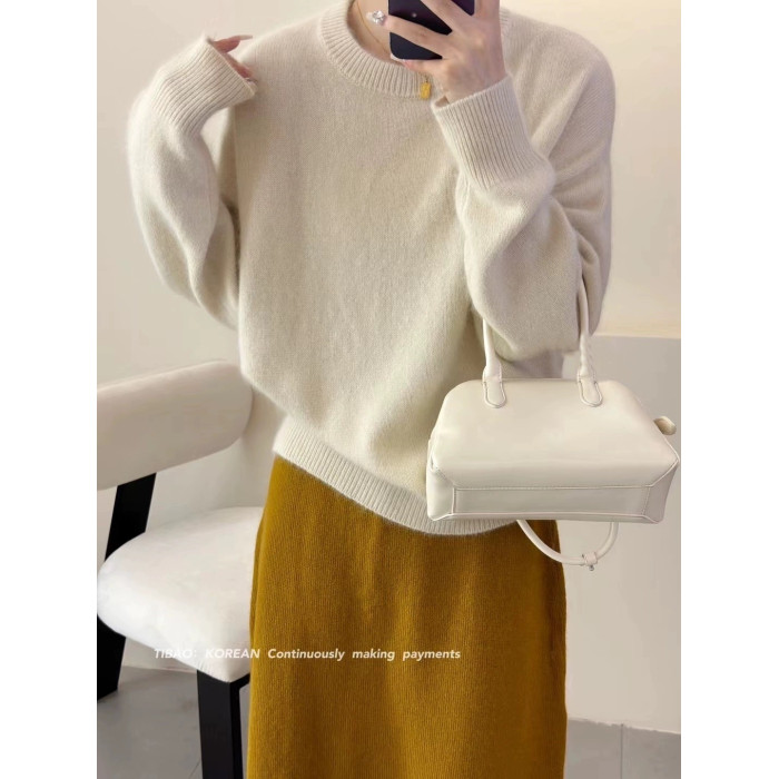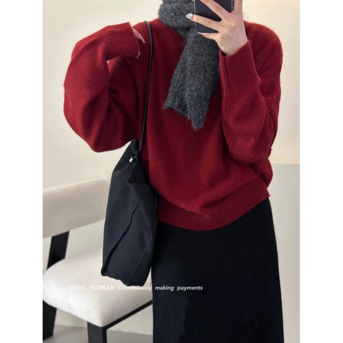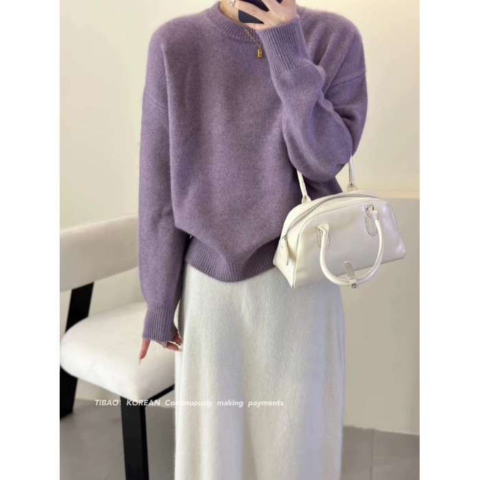 秋冬羊絨衫女圓領毛衣純色套頭寬松慵懶通勤袖羊毛針織打底衫