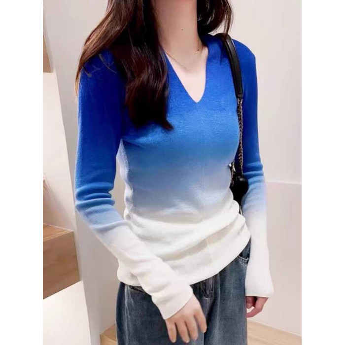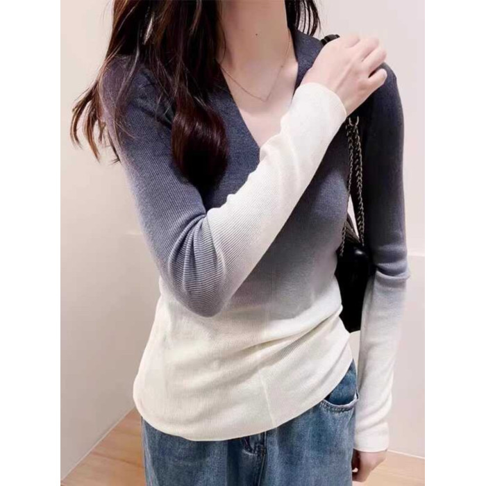 氣質減齡漸變色V領套頭打底衫女冬季新款修身百搭螺紋針織上衣薄