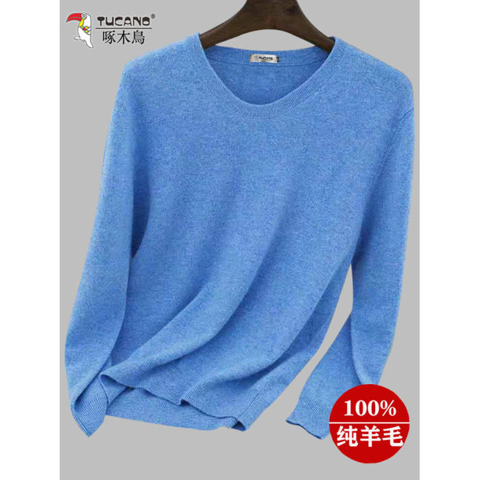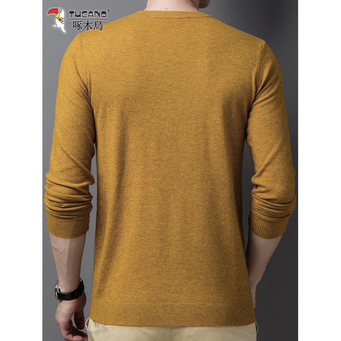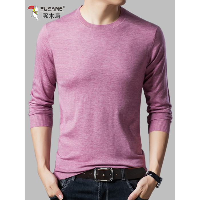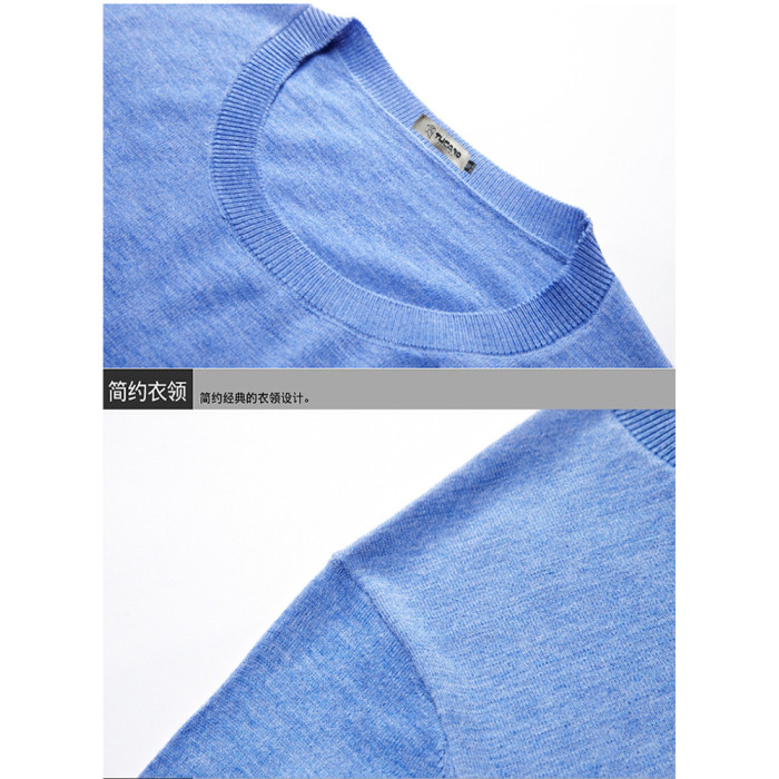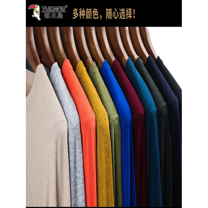 啄木鳥毛衣男春秋薄款圓領羊毛針織打底衫中青年休閒純色V領體恤T
