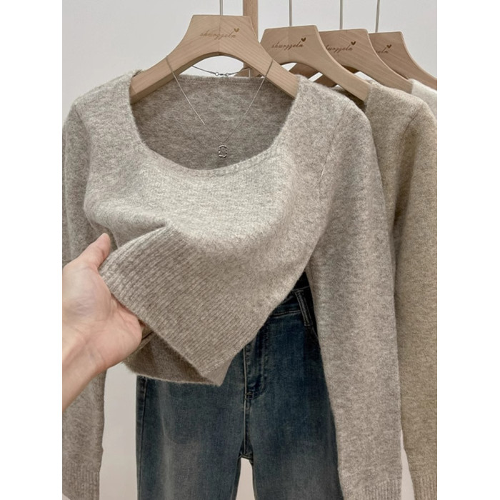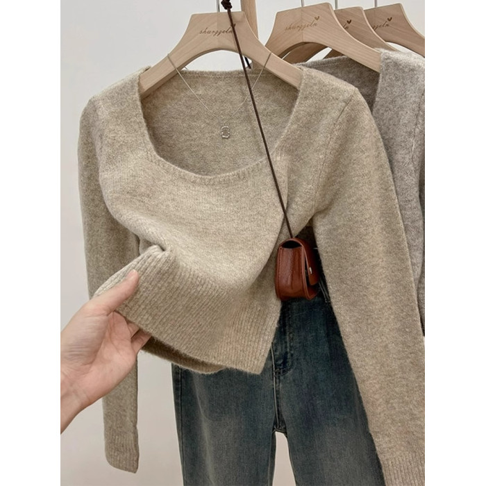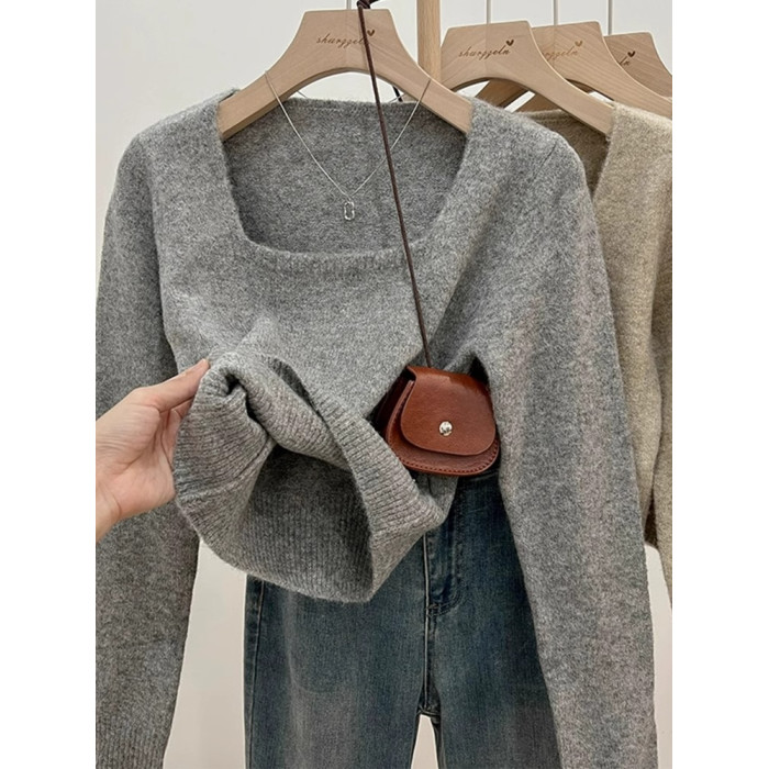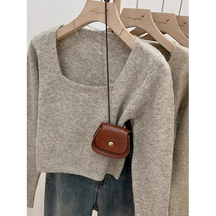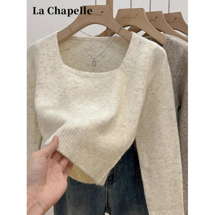 拉夏貝爾針織打底衫女秋季2024新款法式方領毛衣洋氣內搭短款上衣