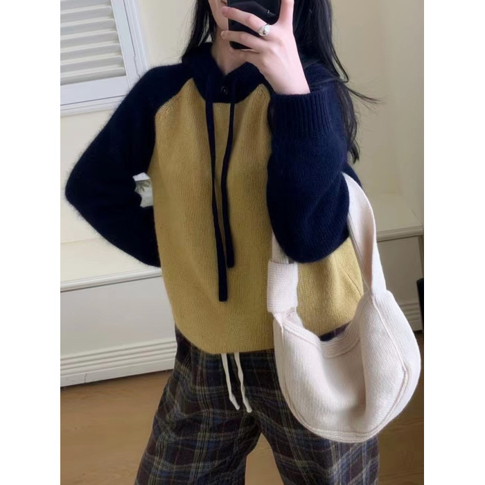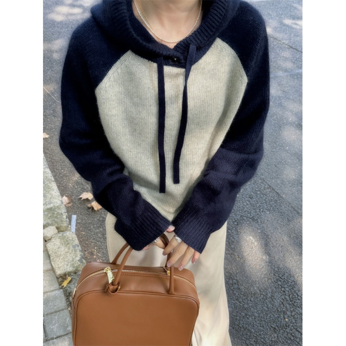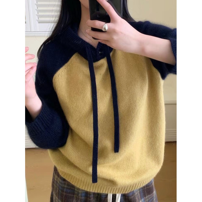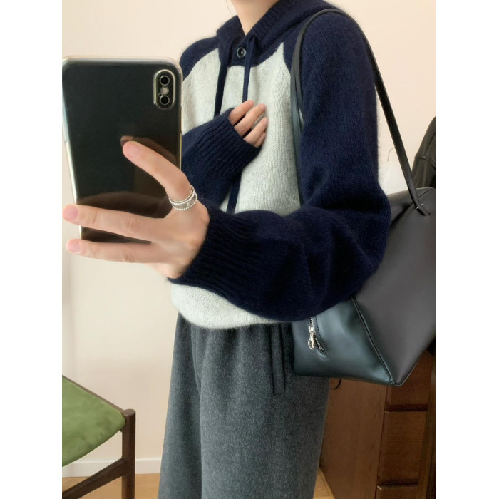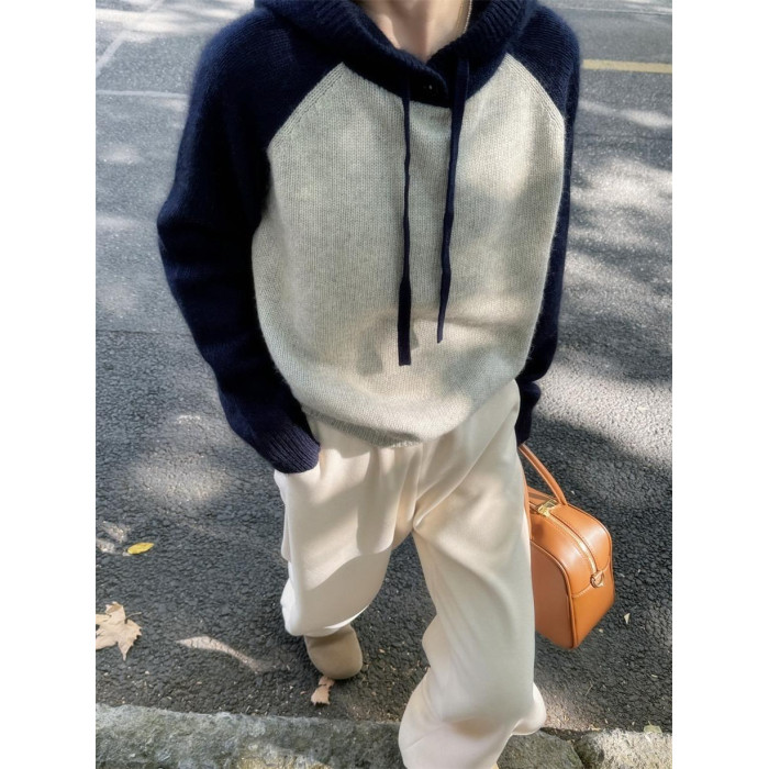 套頭拼色羊毛針織打底衫女秋冬新款連帽百搭保暖內搭帽衫羊絨毛衣