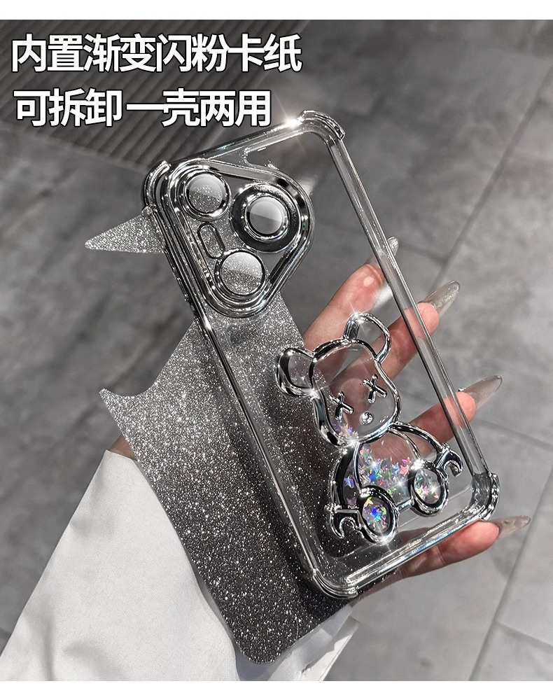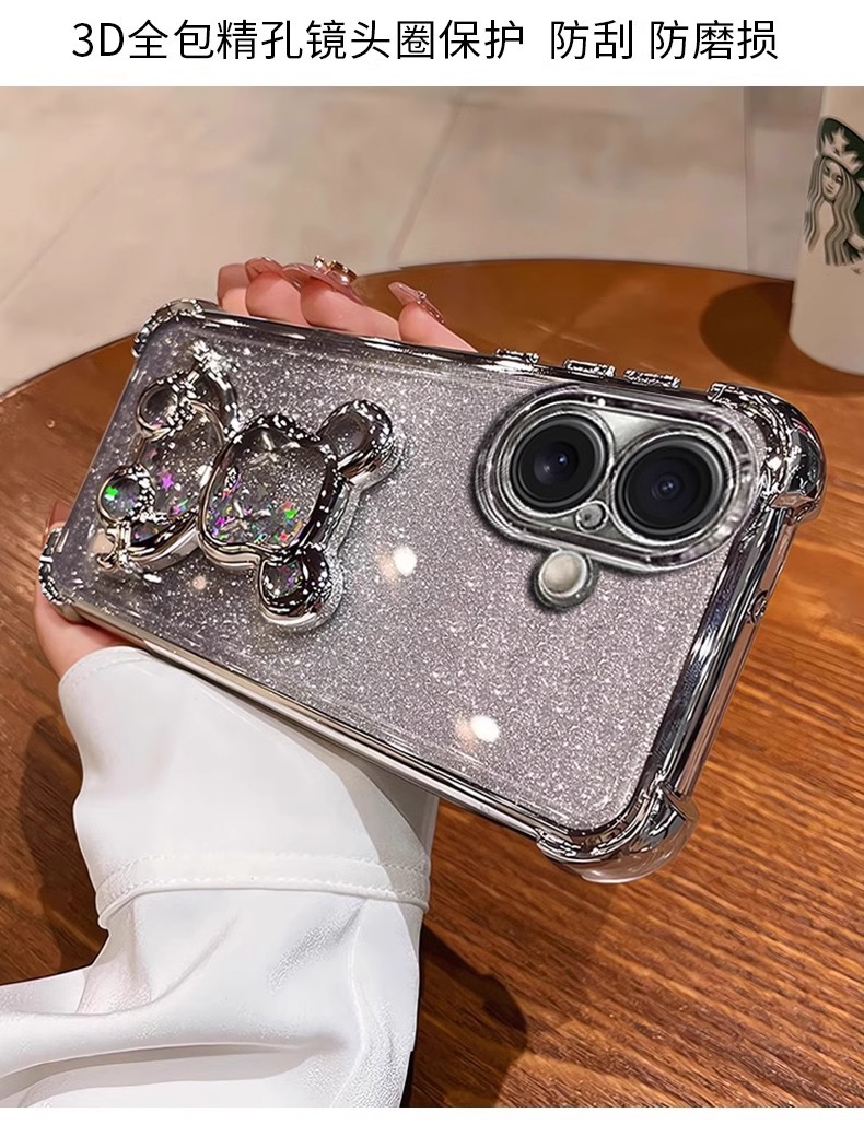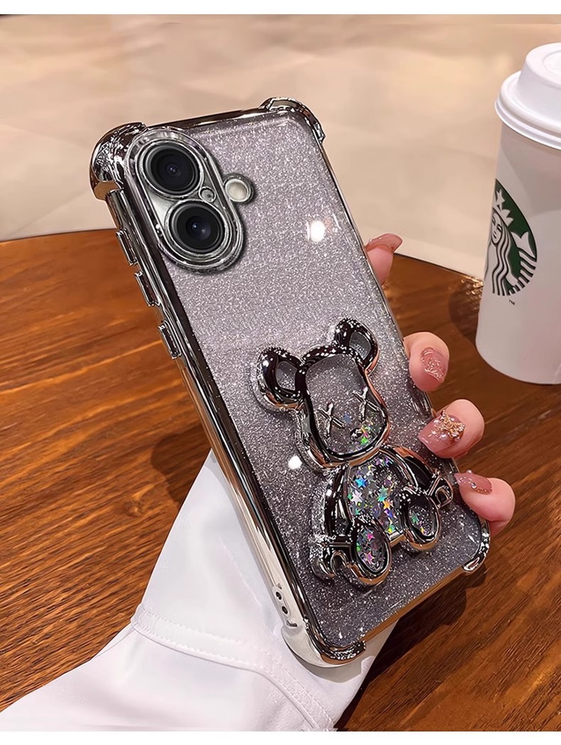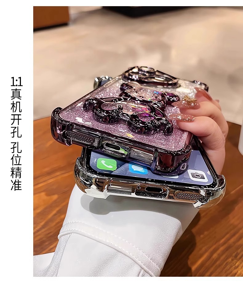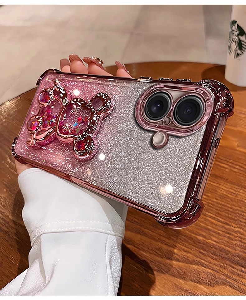 適用iPhone16手機殼四角防摔蘋果15PM電鍍矽膠軟殼散粉立體流沙熊