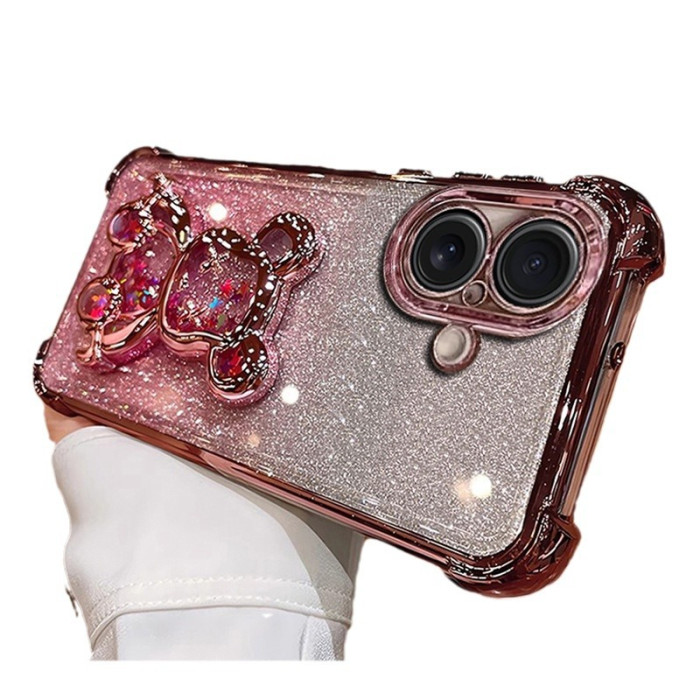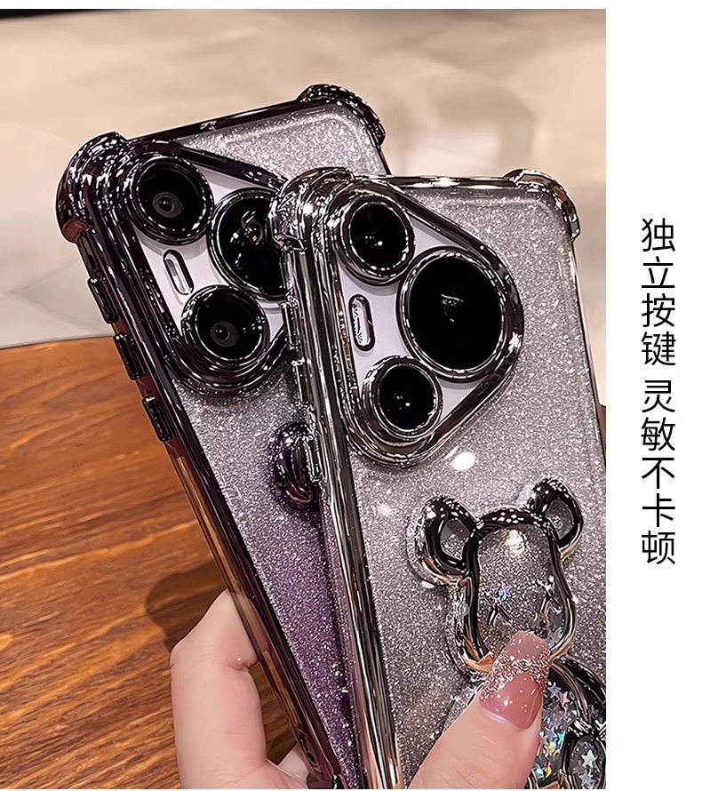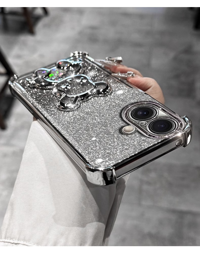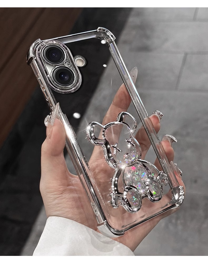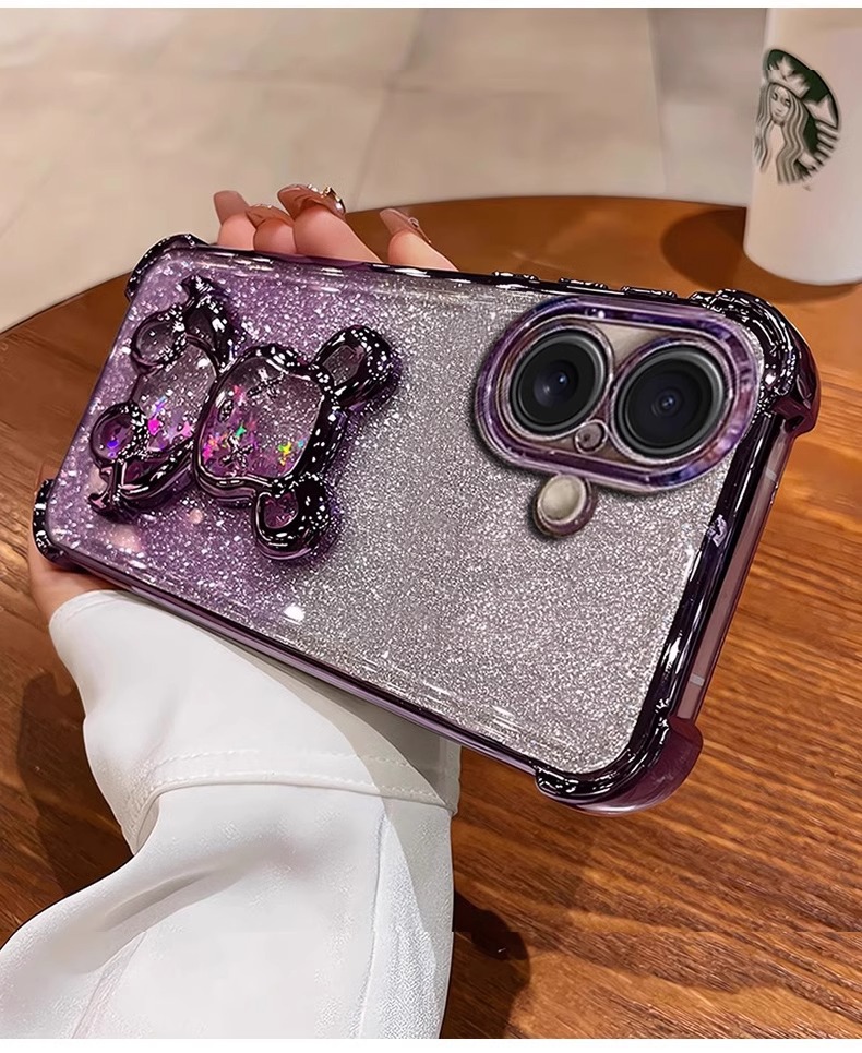 適用iPhone16手機殼四角防摔蘋果15PM電鍍矽膠軟殼散粉立體流沙熊