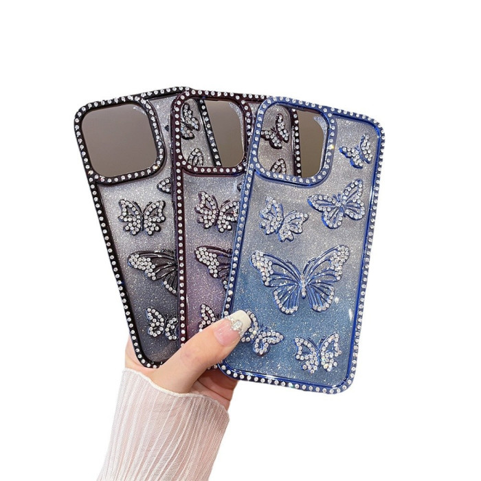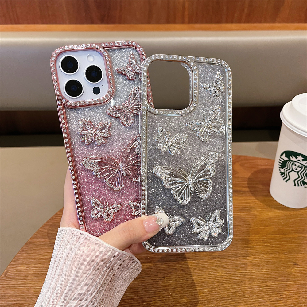 蝴蝶飛鑲鑽+漸變閃粉紙適用iphone16promax手機殼14新款蘋果15/13