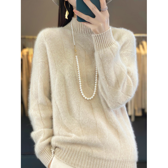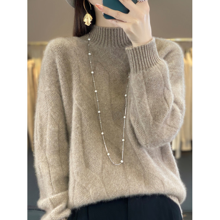 絞花加厚保暖羊絨毛衣女秋冬新款半高領套頭慵懶羊毛針織打底衫潮