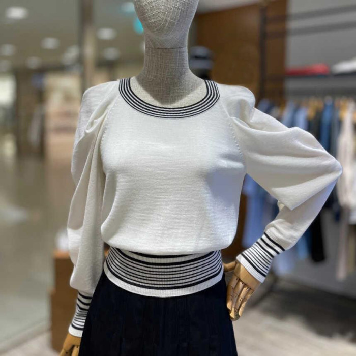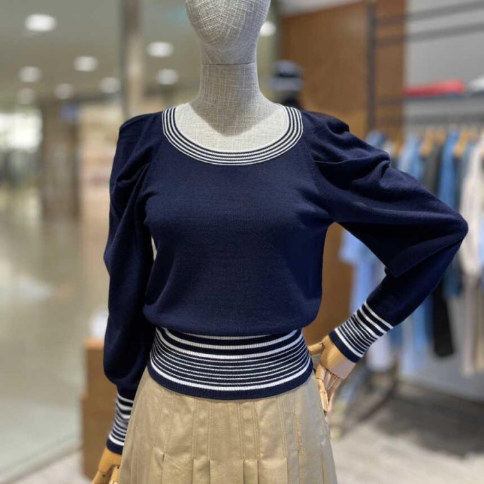 低圓領撞色條紋毛衣女春季新款設計感羊毛長袖針織打底衫顯瘦上衣