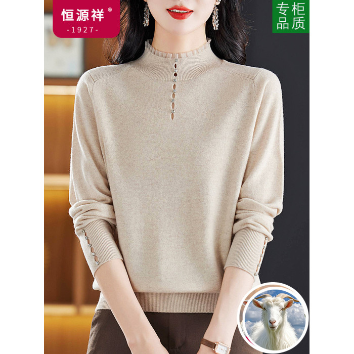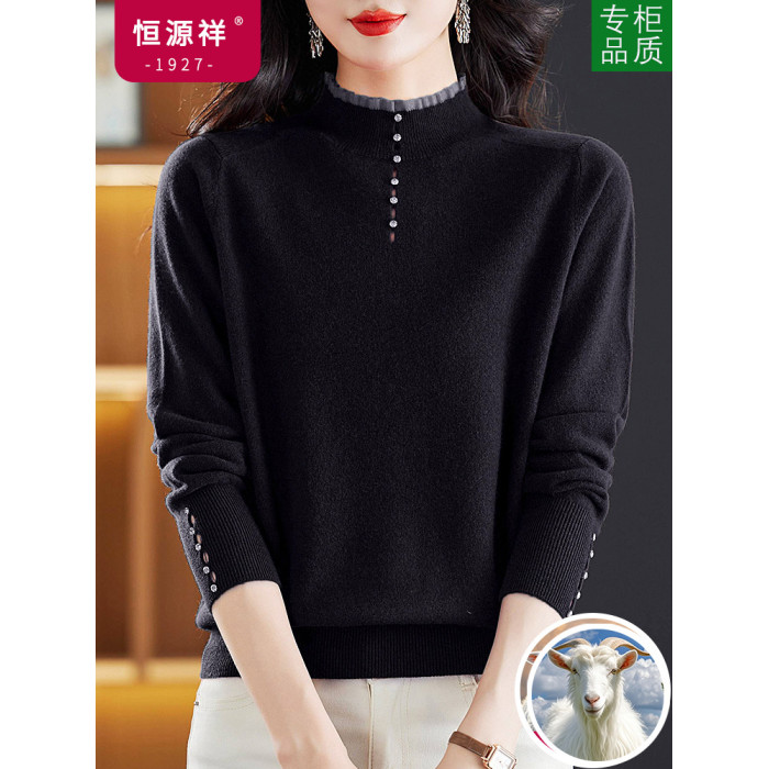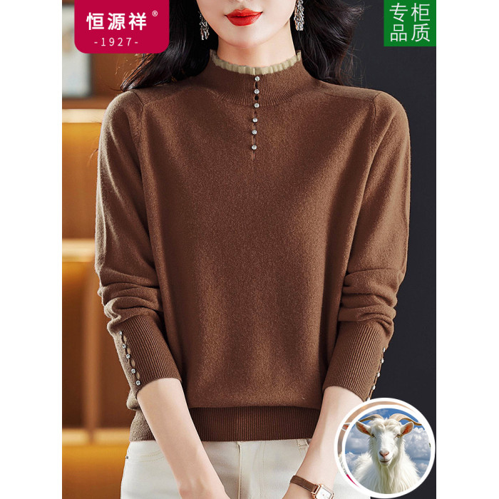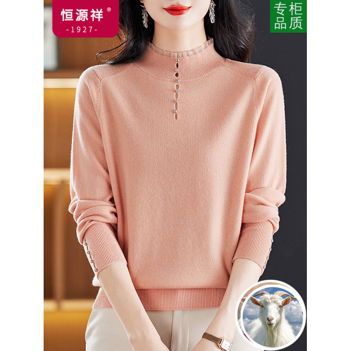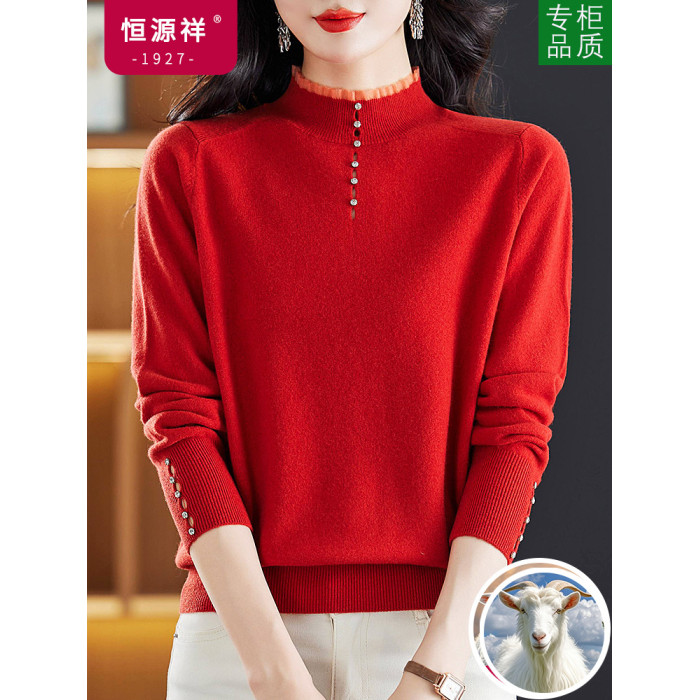 恒源祥半高領羊毛衫女100純羊毛秋冬寬松短款毛衣內搭針織打底衫