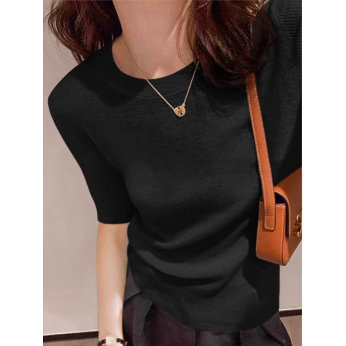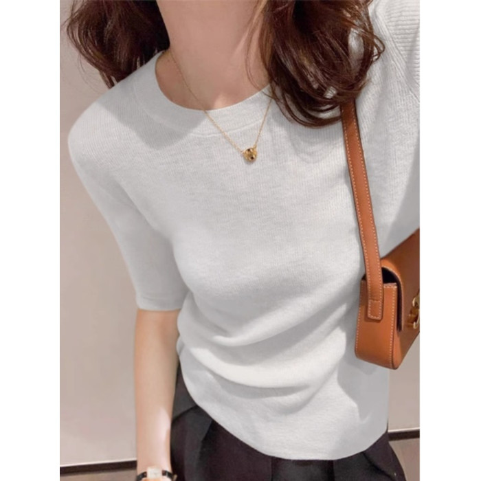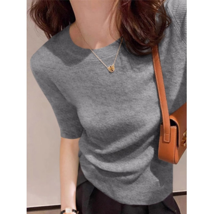 灰色半袖針織衫女2025春秋薄款修身顯瘦冰絲打底衫五分袖圓領上衣