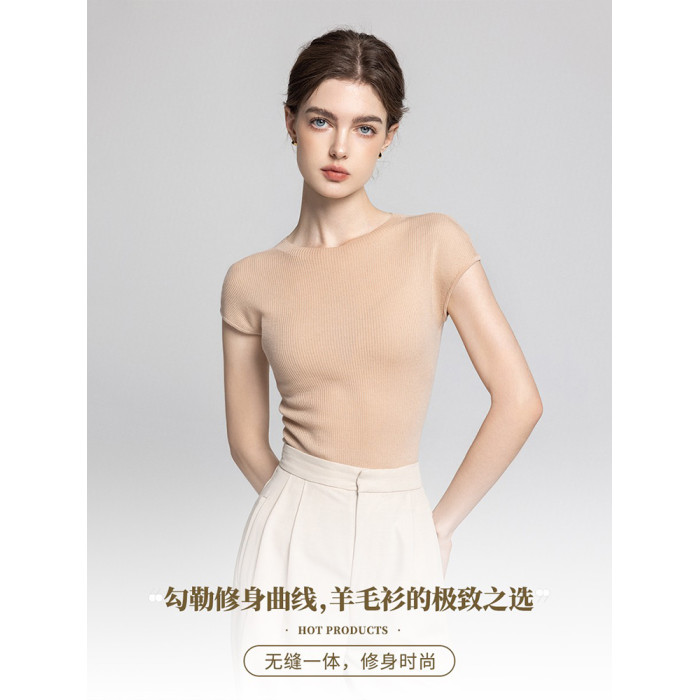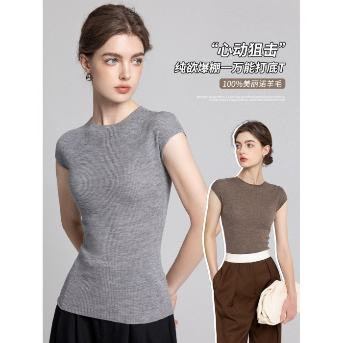 100%美麗諾羊毛打底衫女夏季薄款小飛袖通勤圓領套頭包肩針織內搭