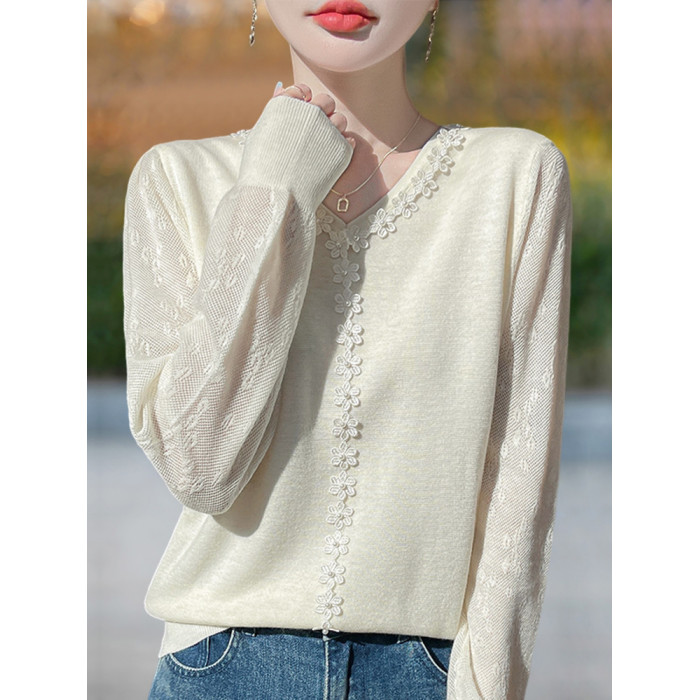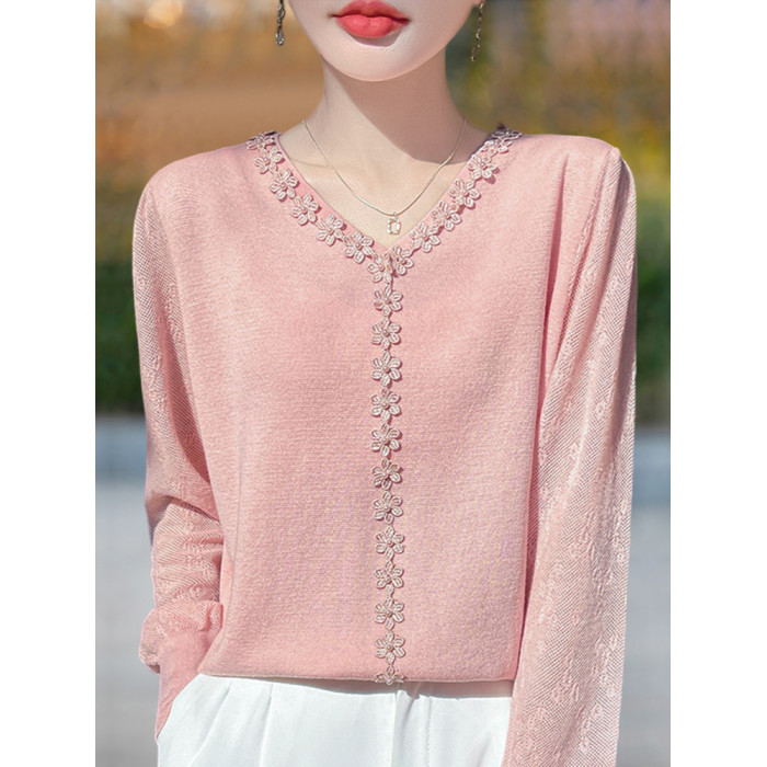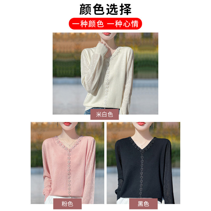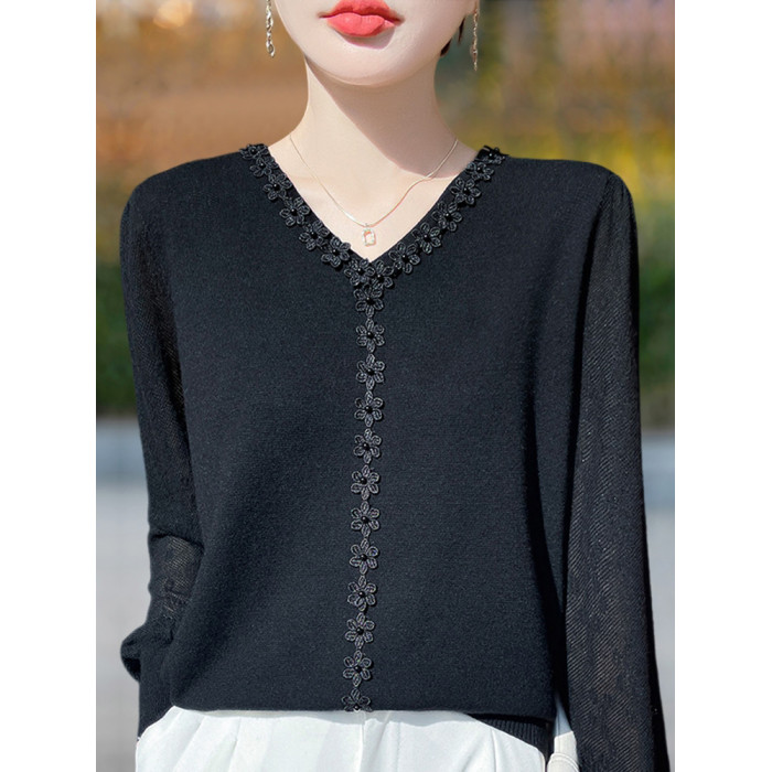胖mm春秋大碼v領女士毛衣遮肚子顯瘦上衣2025新款蕾絲針織打底衫