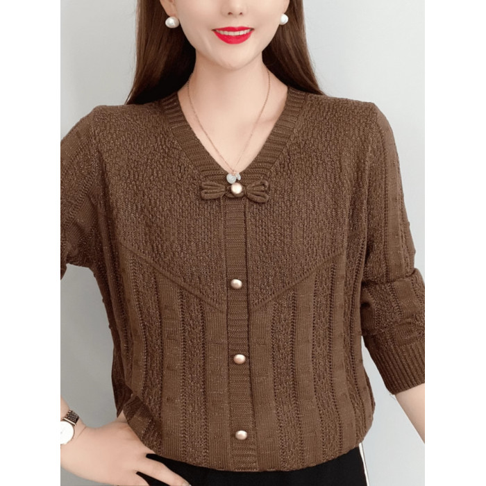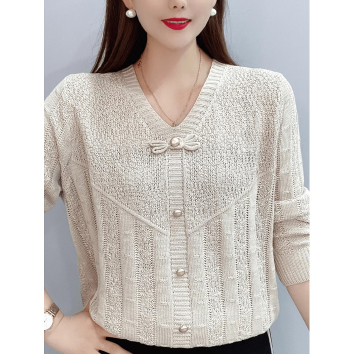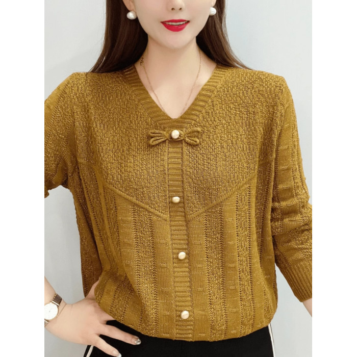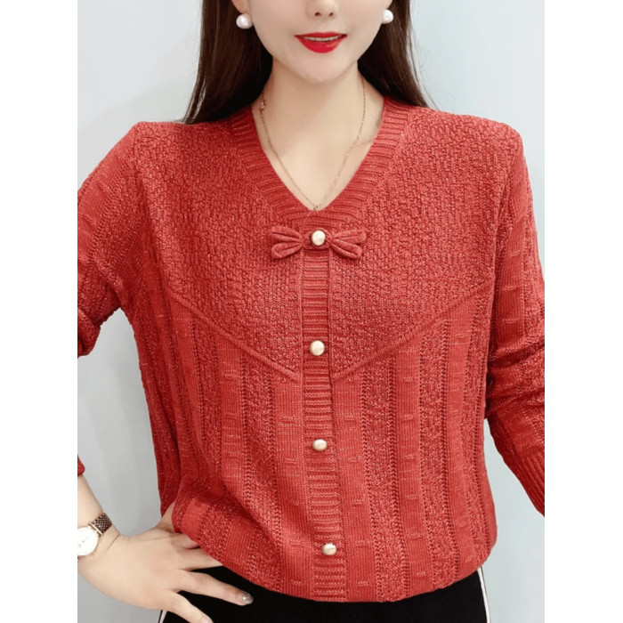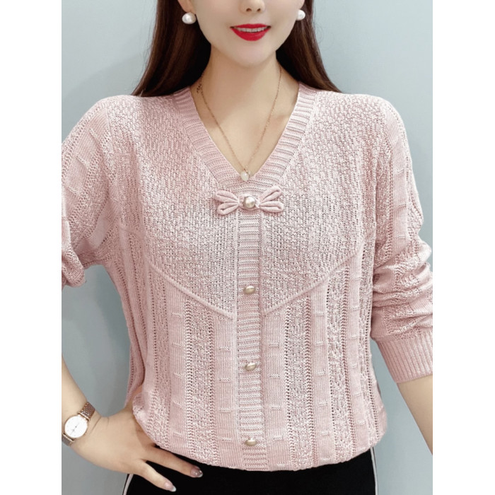 春秋裝薄款純色棉線針織衫女長袖上衣V領套頭外搭韓版寬松打底衫