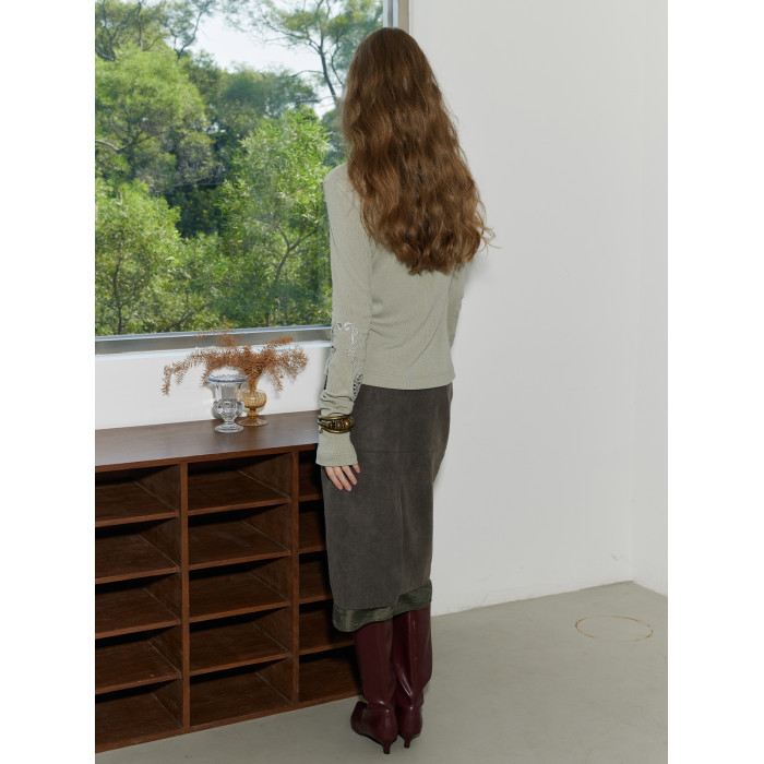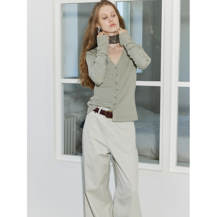 Hiilo 2025春夏新款鳥棲藤蔓綉花上衣V領豆綠親膚百搭開衫打底衫